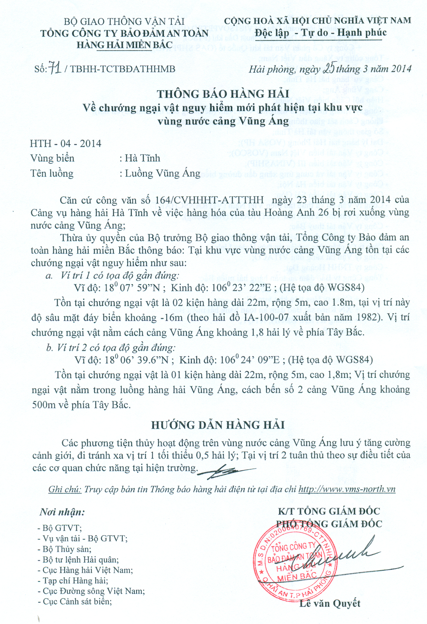 Thừa ủy quyền của Bộ trưởng Bộ giao thông vận tải, Tổng Công ty Bảo đảm an toàn hàng hải miền Bắc thông báo: Tại khu vực vùng nước cảng Vũng Áng tồn tại các chướng ngại vật nguy hiểm như sau: