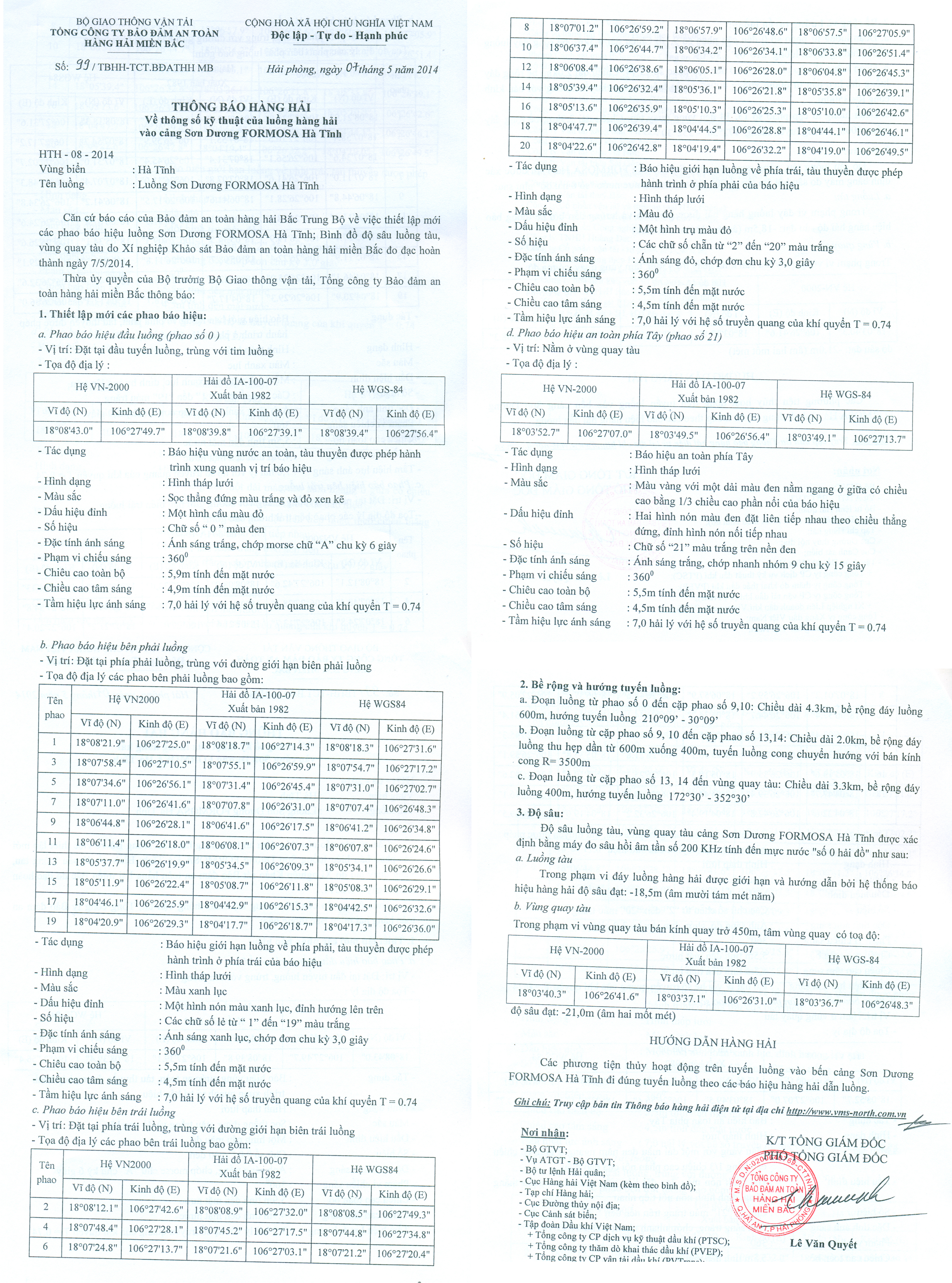 Căn cứ báo cáo của Bảo đảm an toàn hàng hải Bắc Trung Bộ về việc thiết lập mới các phao báo hiệu luồng Sơn Dương FORMOSA Hà Tĩnh; Bình đồ độ sâu luồng tàu, vùng quay tàu do Xí nghiệp Khảo sát Bảo đảm an toàn hàng hải miền Bắc đo đạc hoàn thành ngày 7/5/2014.