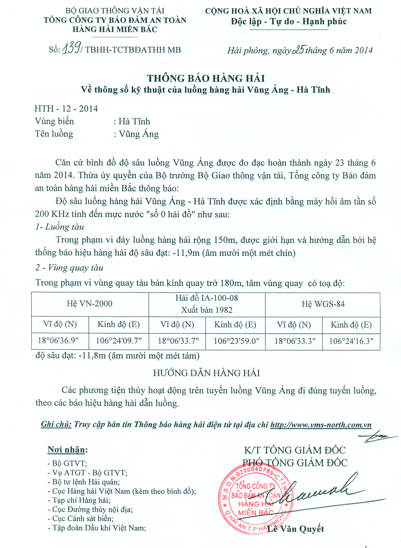 Căn cứ bình đồ độ sâu luồng Vũng Áng được đo đạc hoàn thành ngày 23 tháng 6 năm 2014. Thừa ủy quyền của Bộ trưởng Bộ Giao thông vận tải, Tổng công ty Bảo đảm an toàn hàng hải miền Bắc thông báo: