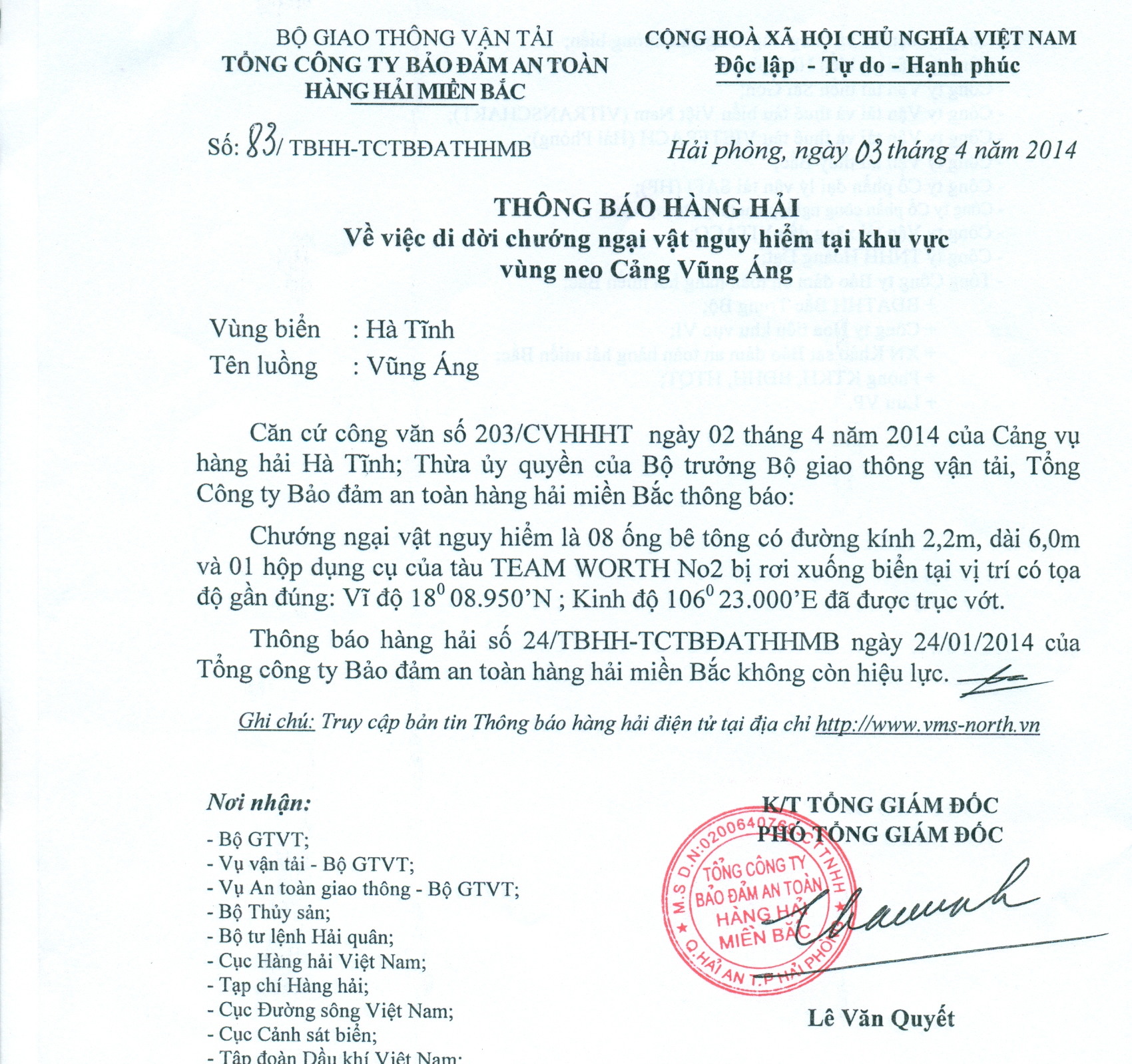 Căn cứ công văn số 203/CVHHHT ngày 02 tháng 4 năm 2014 của Cảng vụ hàng hải Hà Tĩnh; Thừa ủy quyền của Bộ trưởng Bộ giao thông vận tải, Tổng Công ty Bảo đảm an toàn hàng hải miền Bắc thông báo: