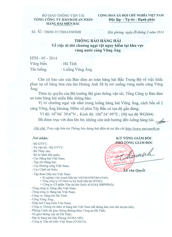 Thừa ủy quyền của Bộ trưởng Bộ giao thông vận tải, Tổng Công ty Bảo đảm an toàn hàng hải miền Bắc thông báo: