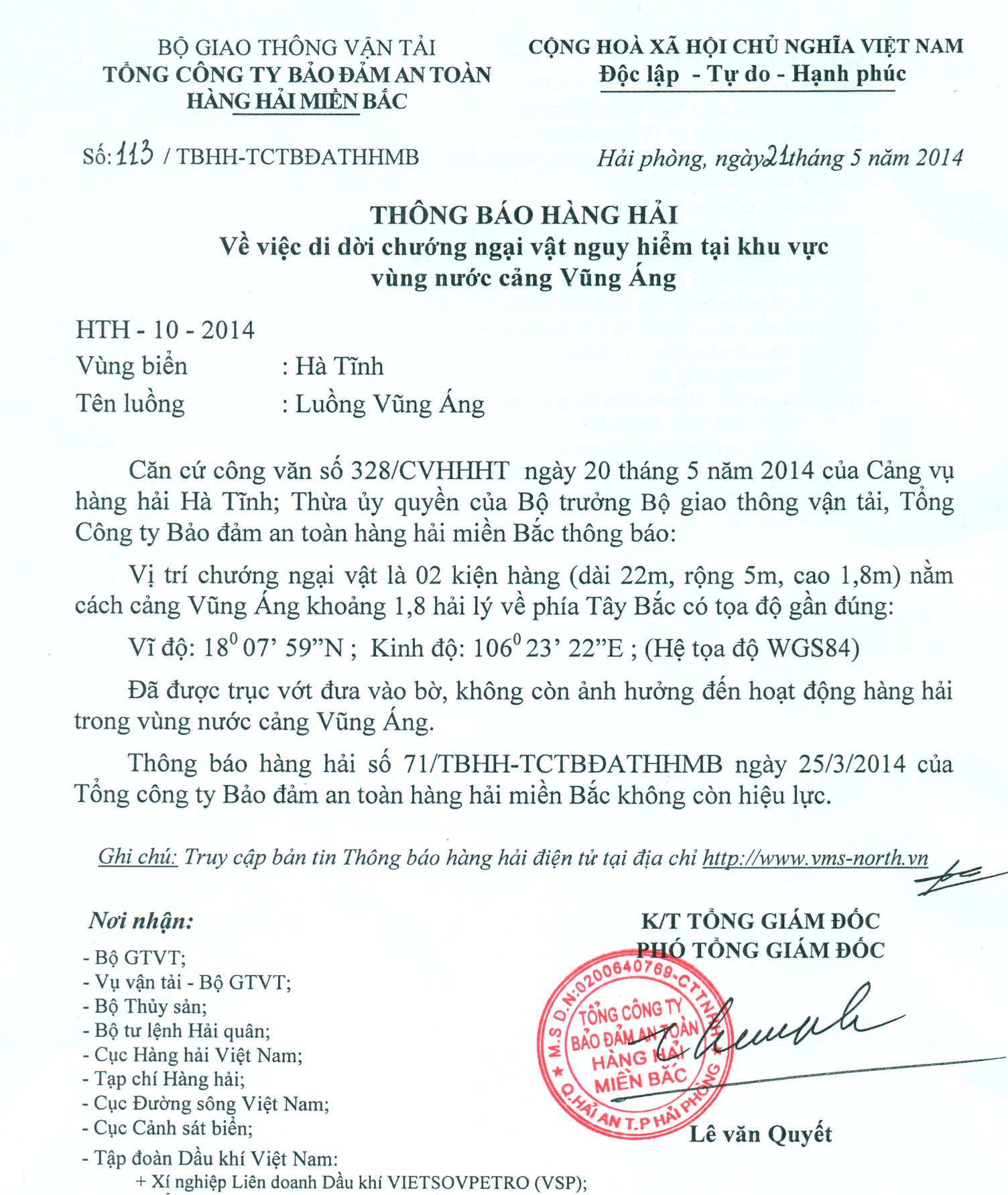 Căn cứ công văn số 328/CVHHHT ngày 20 tháng 5 năm 2014 của Cảng vụ hàng hải Hà Tĩnh; Thừa ủy quyền của Bộ trưởng Bộ giao thông vận tải, Tổng Công ty Bảo đảm an toàn hàng hải miền Bắc thông báo: