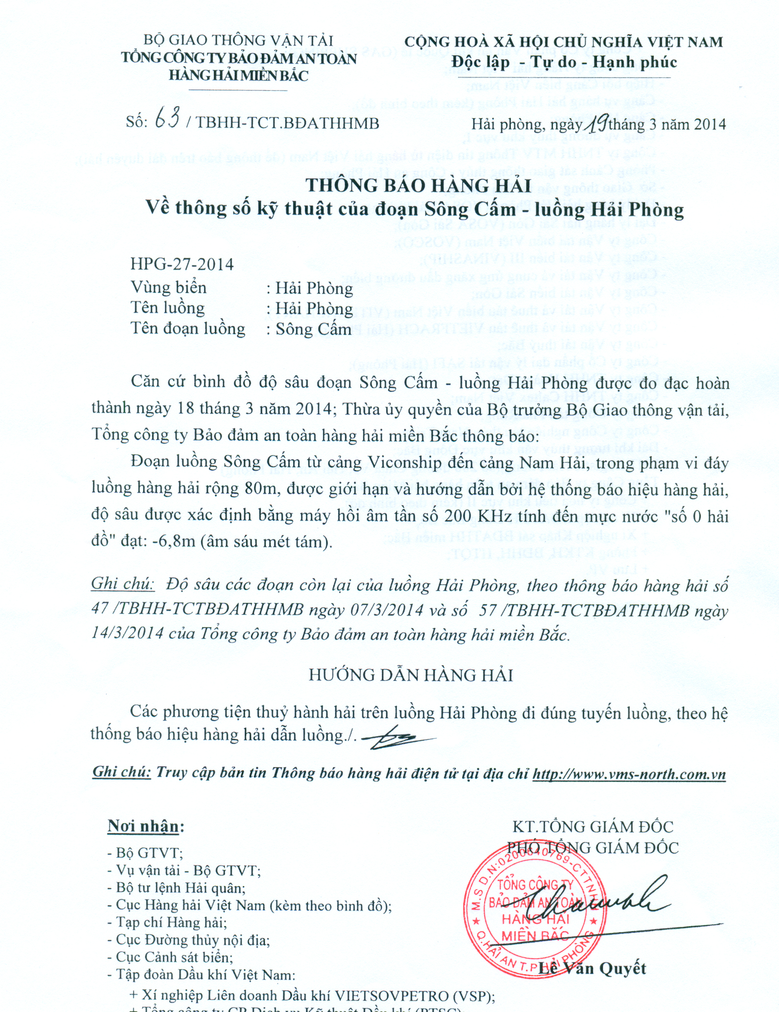 Căn cứ bình đồ độ sâu đoạn Sông Cấm - luồng Hải Phòng được đo đạc hoàn thành ngày 18 tháng 3 năm 2014; Thừa ủy quyền của Bộ trưởng Bộ Giao thông vận tải, Tổng công ty Bảo đảm an toàn hàng hải miền Bắc thông báo:
