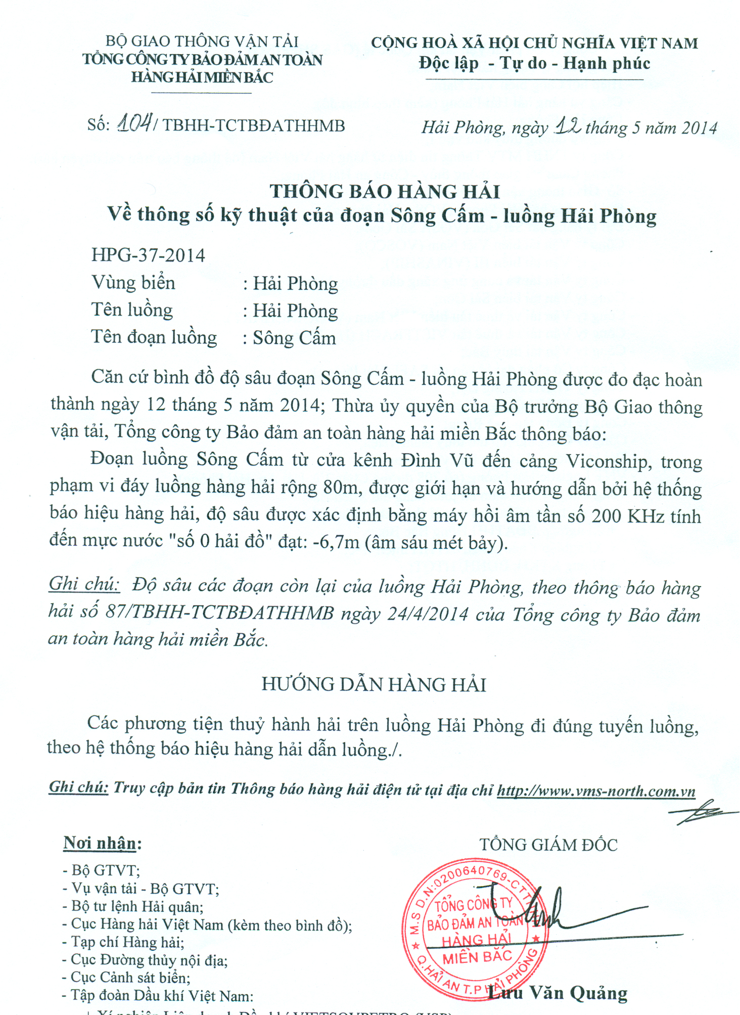 Căn cứ bình đồ độ sâu đoạn Sông Cấm - luồng Hải Phòng được đo đạc hoàn thành ngày 12 tháng 5 năm 2014; Thừa ủy quyền của Bộ trưởng Bộ Giao thông vận tải, Tổng công ty Bảo đảm an toàn hàng hải miền Bắc thông báo:
