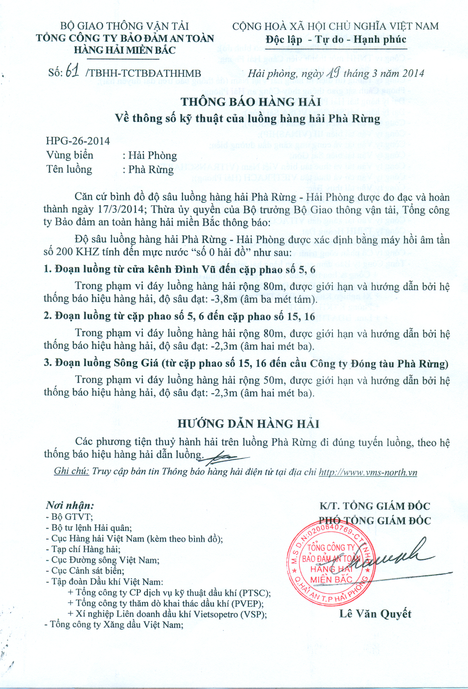Căn cứ bình đồ độ sâu luồng hàng hải Phà Rừng - Hải Phòng được đo đạc và hoàn thành ngày 17/3/2014; Thừa ủy quyền của Bộ trưởng Bộ Giao thông vận tải, Tổng công ty Bảo đảm an toàn hàng hải miền Bắc thông báo: