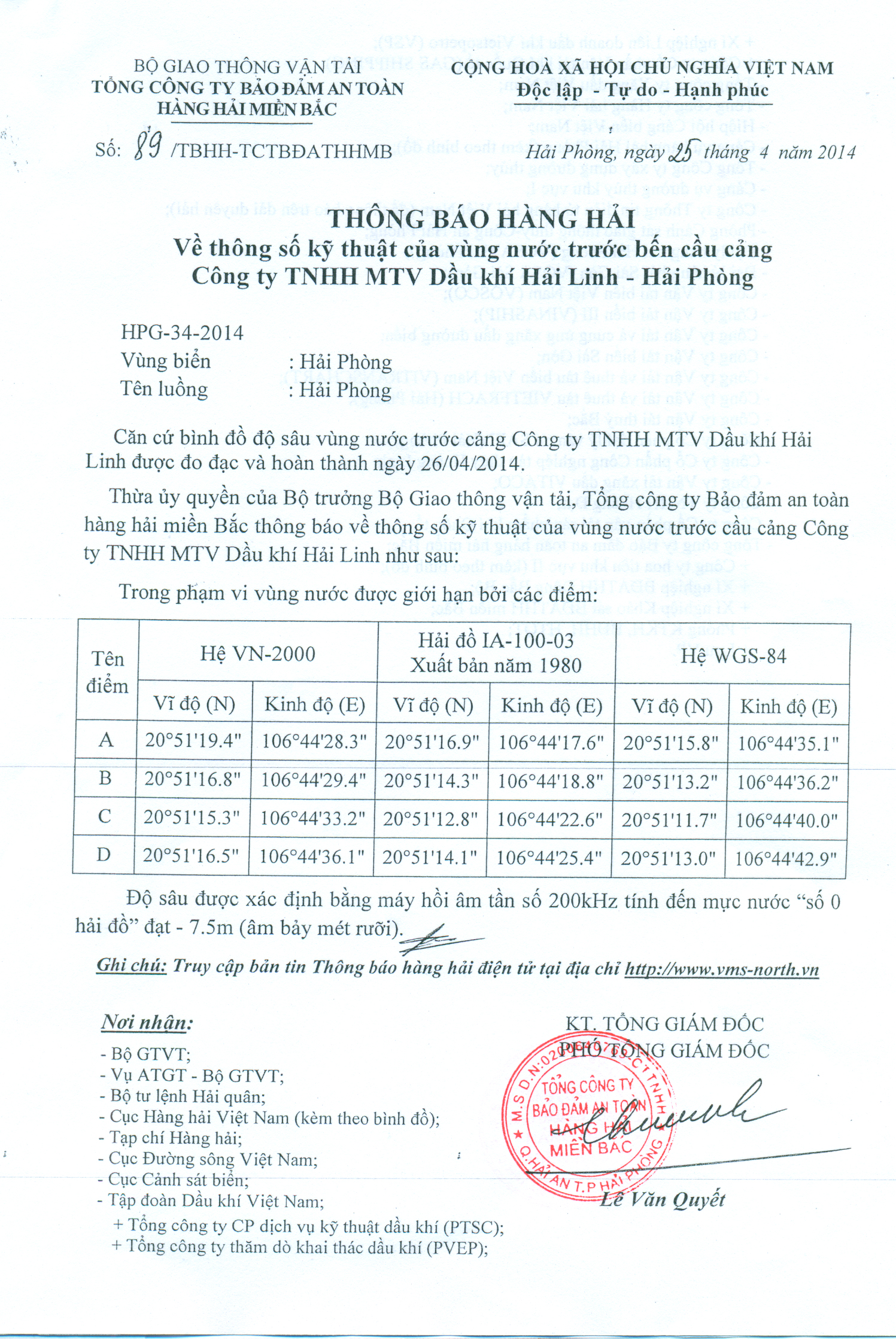 Thừa ủy quyền của Bộ trưởng Bộ Giao thông vận tải, Tổng công ty Bảo đảm an toàn hàng hải miền Bắc thông báo về thông số kỹ thuật của vùng nước trước cầu cảng Công ty TNHH MTV Dầu khí Hải Linh như sau: