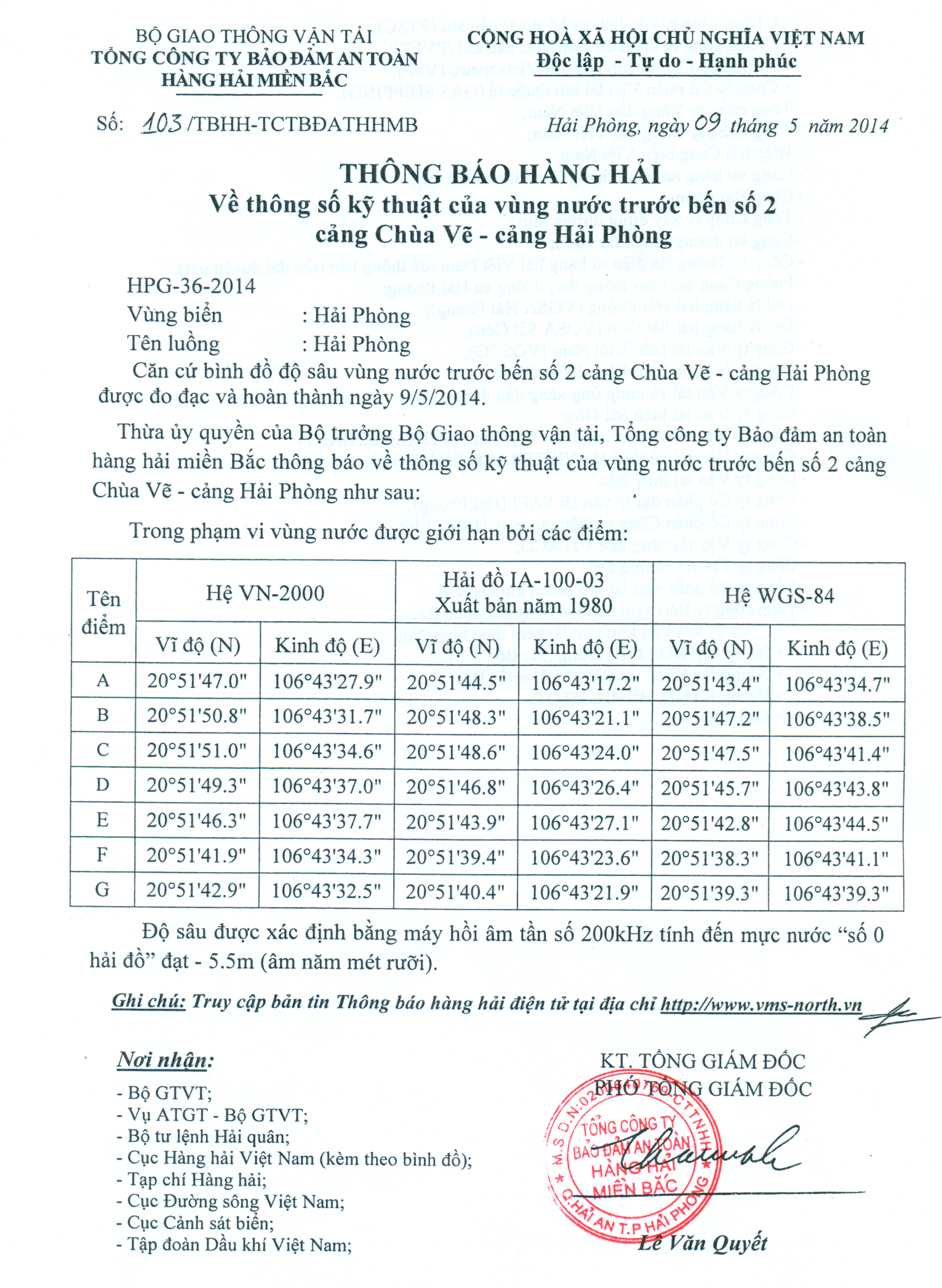 Thừa ủy quyền của Bộ trưởng Bộ Giao thông vận tải, Tổng công ty Bảo đảm an toàn hàng hải miền Bắc thông báo về thông số kỹ thuật của vùng nước trước bến số 2 cảng Chùa Vẽ - cảng Hải Phòng như sau: