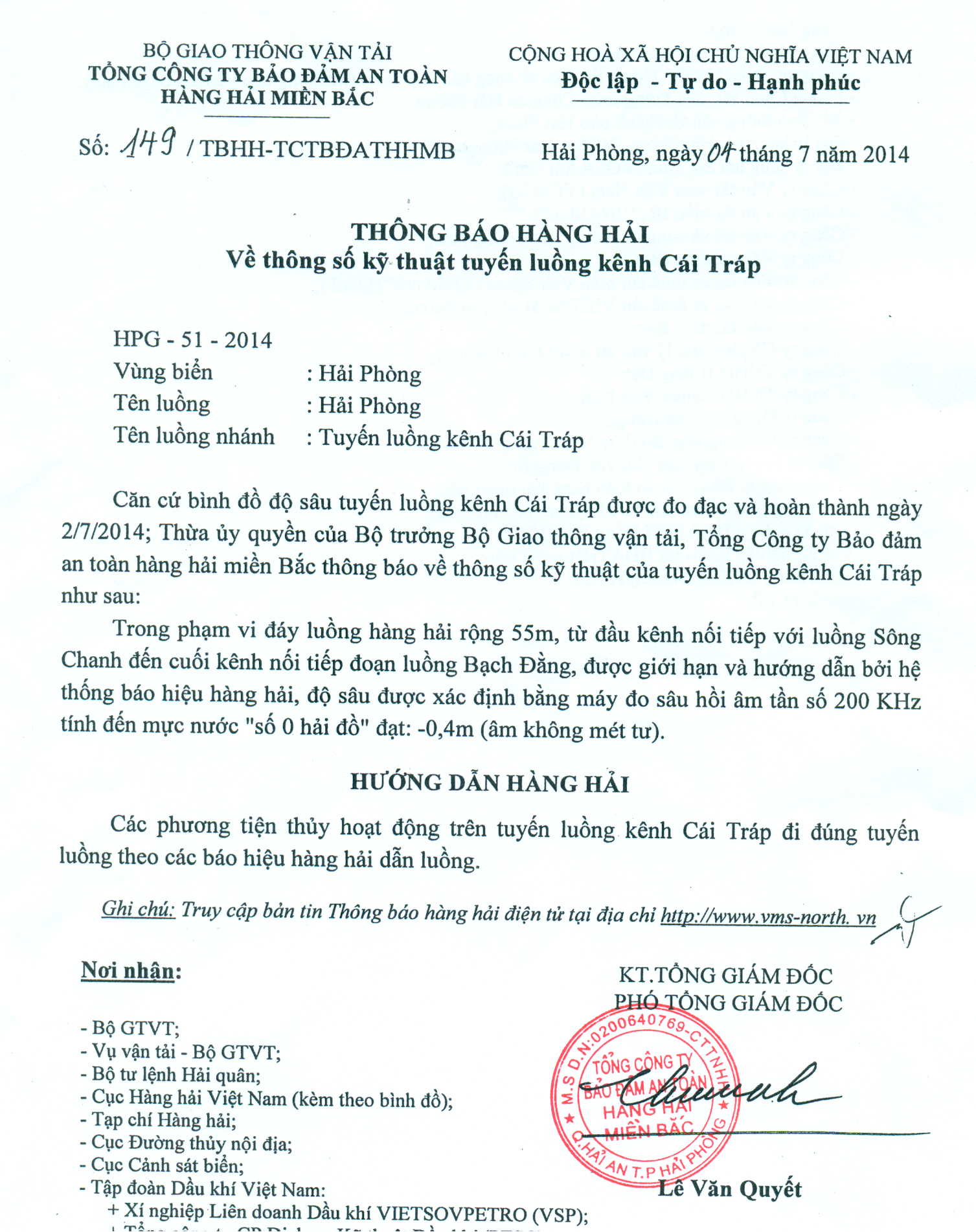 Căn cứ bình đồ độ sâu tuyến luồng kênh Cái Tráp được đo đạc và hoàn thành ngày 2/7/2014; Thừa ủy quyền của Bộ trưởng Bộ Giao thông vận tải, Tổng Công ty Bảo đảm an toàn hàng hải miền Bắc thông báo về thông số kỹ thuật của tuyến luồng kênh Cái Tráp như sau: