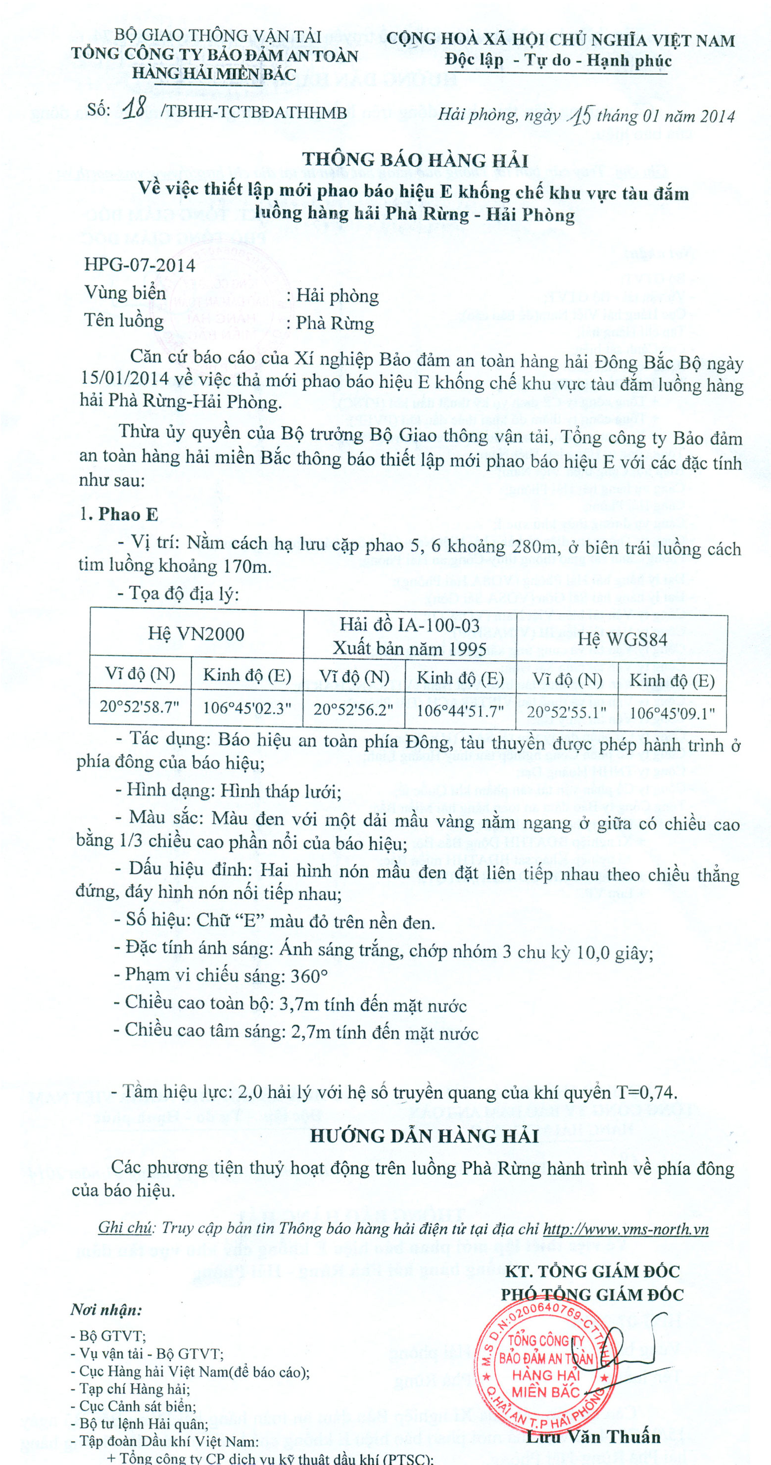 Căn cứ báo cáo của Xí nghiệp Bảo đảm an toàn hàng hải Đông Bắc Bộ ngày 15/01/2014 về việc thả mới phao báo hiệu E khống chế khu vực tàu đắm luồng hàng hải Phà Rừng-Hải Phòng.