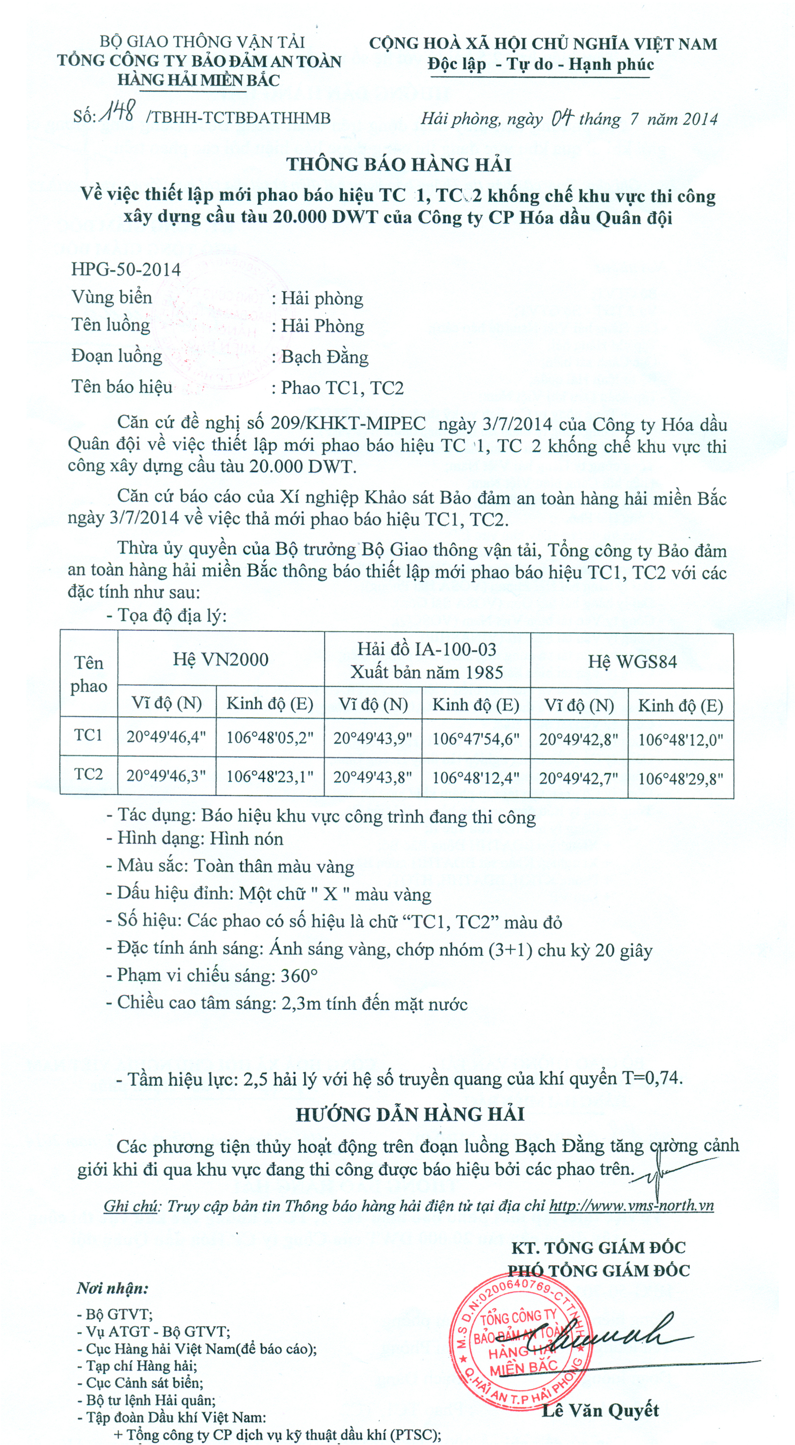 Căn cứ báo cáo của Xí nghiệp Khảo sát Bảo đảm an toàn hàng hải miền Bắc ngày 3/7/2014 về việc thả mới phao báo hiệu TC1, TC2.
