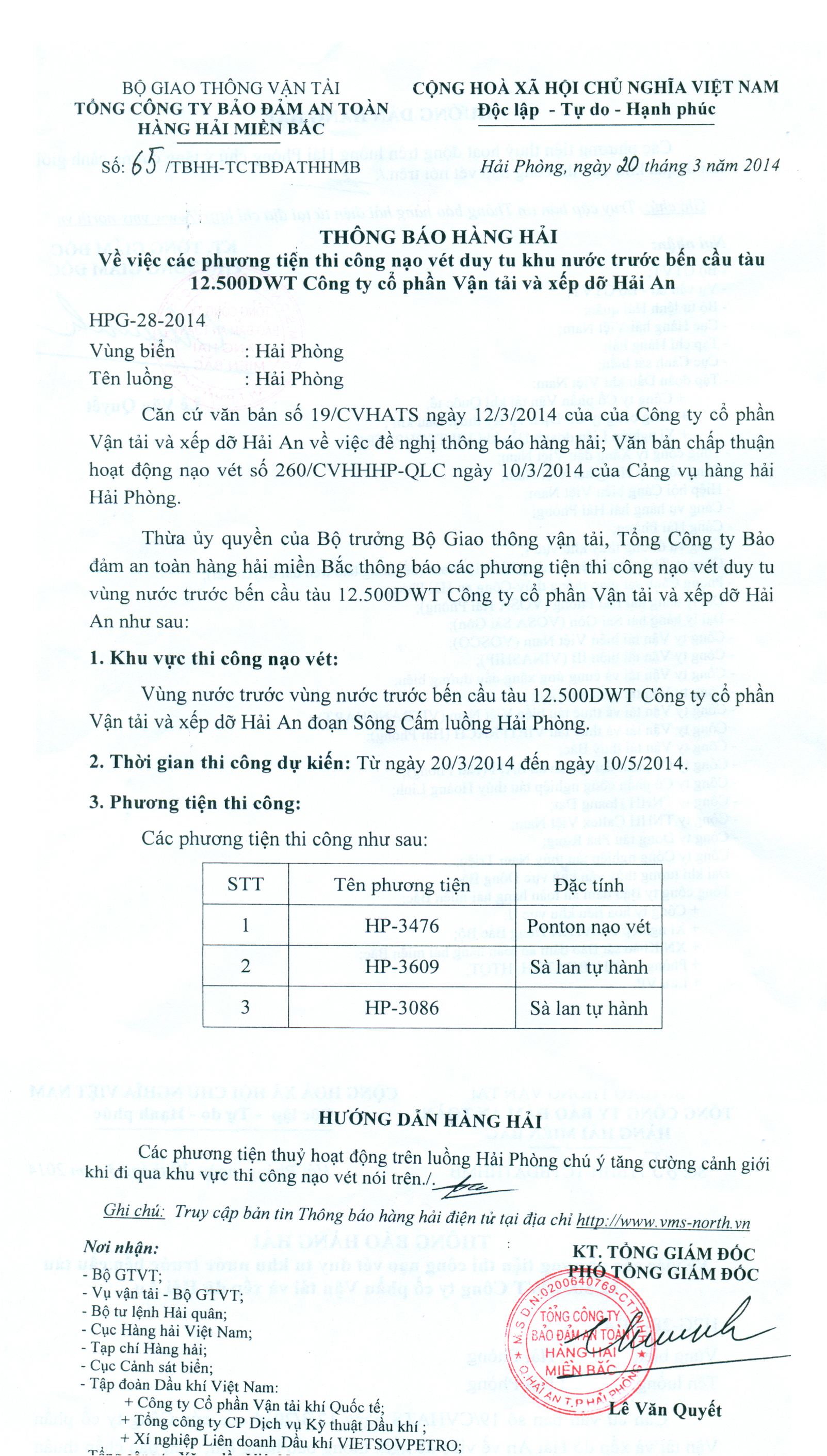 Thừa ủy quyền của Bộ trưởng Bộ Giao thông vận tải, Tổng Công ty Bảo đảm an toàn hàng hải miền Bắc thông báo các phương tiện thi công nạo vét duy tu vùng nước trước bến cầu tàu 12.500DWT Công ty cổ phần Vận tải và xếp dỡ Hải An như sau: