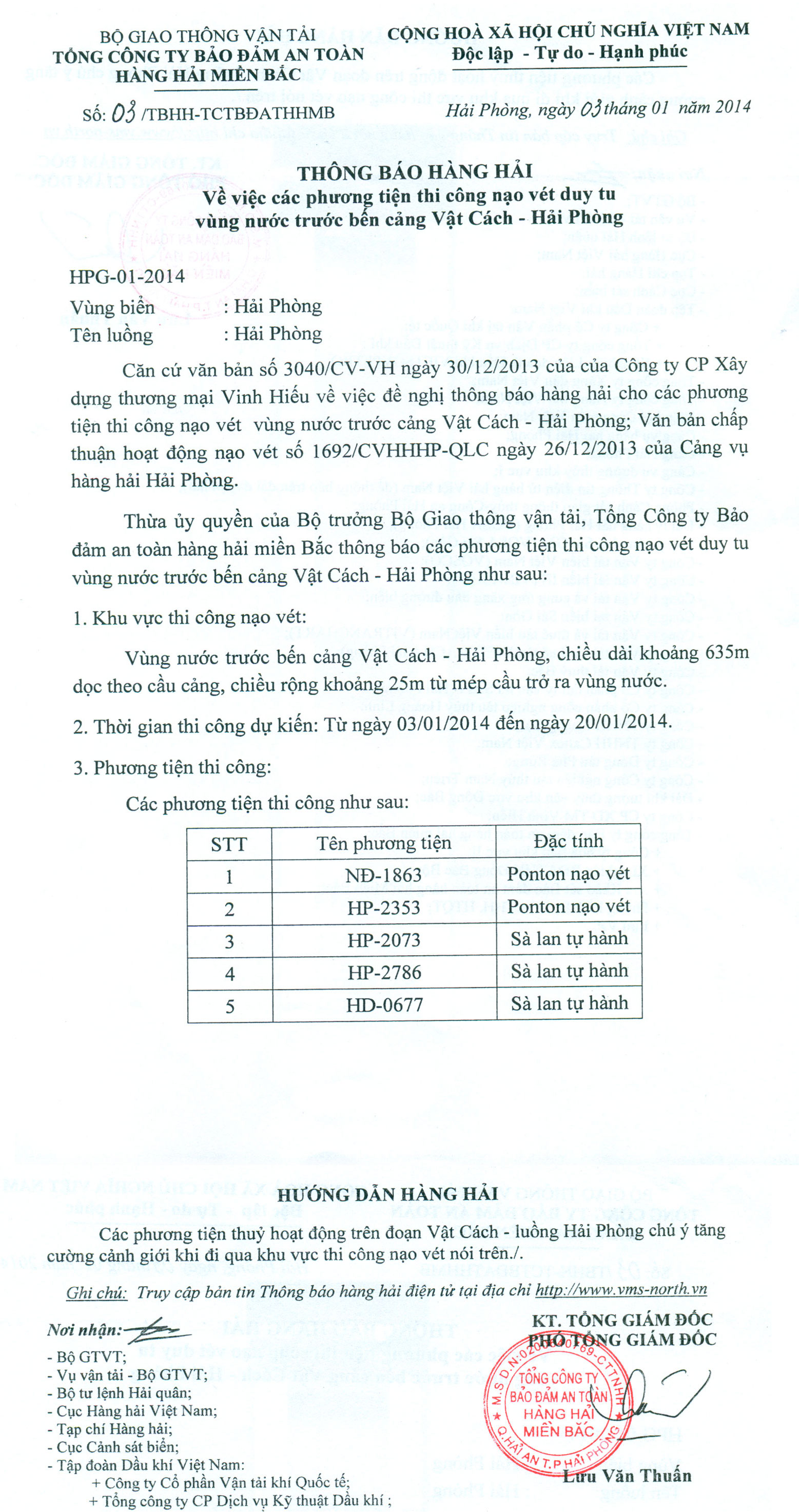 Thừa ủy quyền của Bộ trưởng Bộ Giao thông vận tải, Tổng Công ty Bảo đảm an toàn hàng hải miền Bắc thông báo các phương tiện thi công nạo vét duy tu vùng nước trước bến cảng Vật Cách - Hải Phòng như sau: