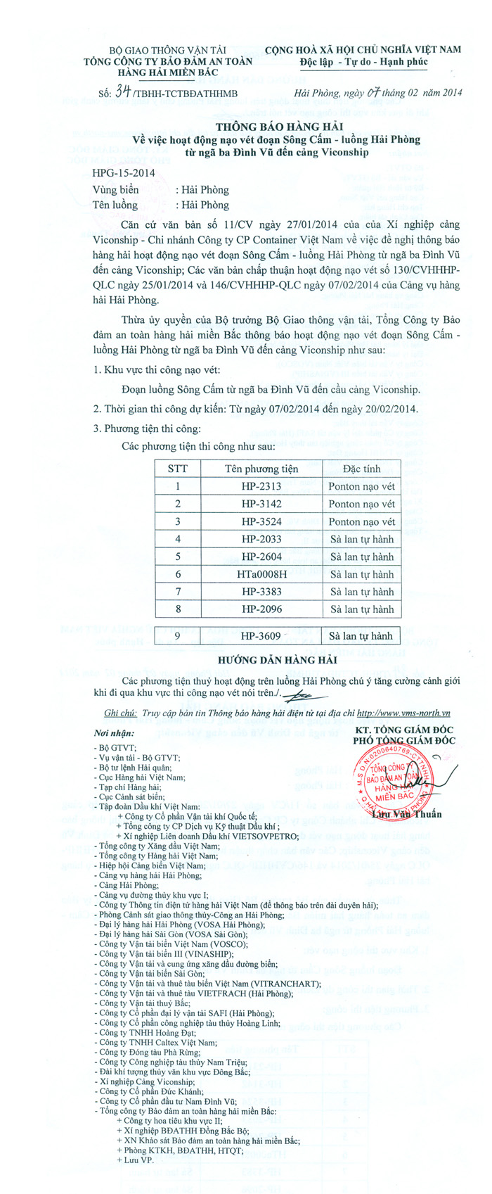 Căn cứ văn bản số 11/CV ngày 27/01/2014 của của Xí nghiệp cảng Viconship - Chi nhánh Công ty CP Container Việt Nam về việc đề nghị thông báo hàng hải hoạt động nạo vét đoạn Sông Cấm - luồng Hải Phòng từ ngã ba Đình Vũ đến cảng Viconship; Các văn bản chấp thuận hoạt động nạo vét số 130/CVHHHP-QLC ngày 25/01/2014 và 146/CVHHHP-QLC ngày 07/02/2014 của Cảng vụ hàng hải Hải Phòng.