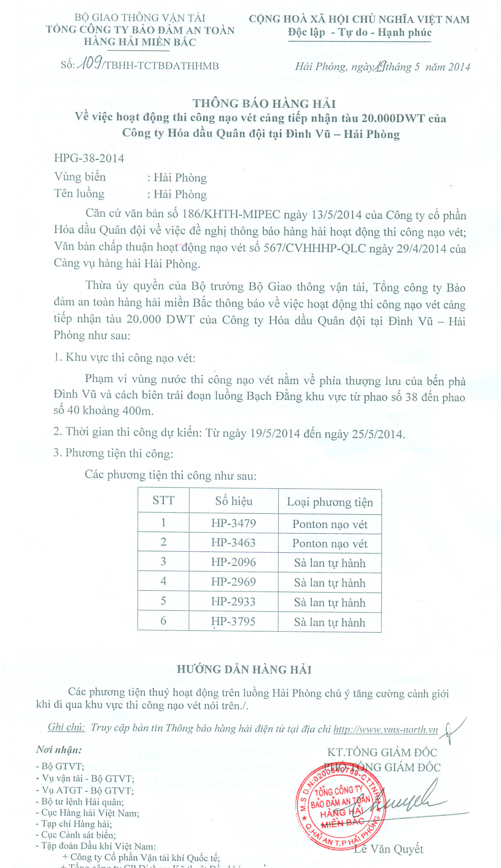 Thừa ủy quyền của Bộ trưởng Bộ Giao thông vận tải, Tổng công ty Bảo đảm an toàn hàng hải miền Bắc thông báo về việc hoạt động thi công nạo vét cảng tiếp nhận tàu 20.000 DWT của Công ty Hóa dầu Quân đội tại Đình Vũ – Hải Phòng như sau: