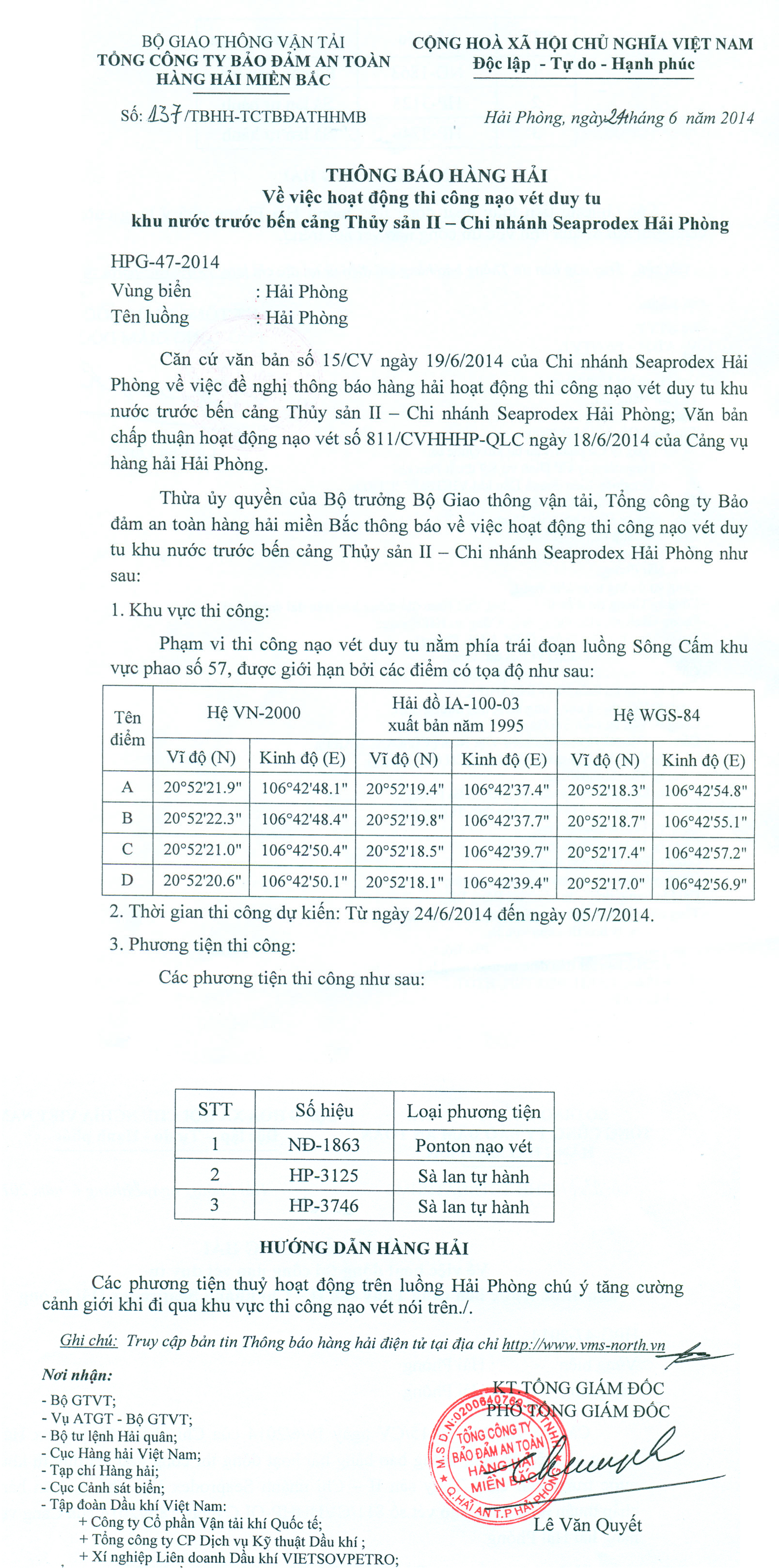 Thừa ủy quyền của Bộ trưởng Bộ Giao thông vận tải, Tổng công ty Bảo đảm an toàn hàng hải miền Bắc thông báo về việc hoạt động thi công nạo vét duy tu khu nước trước bến cảng Thủy sản II – Chi nhánh Seaprodex Hải Phòng như sau: