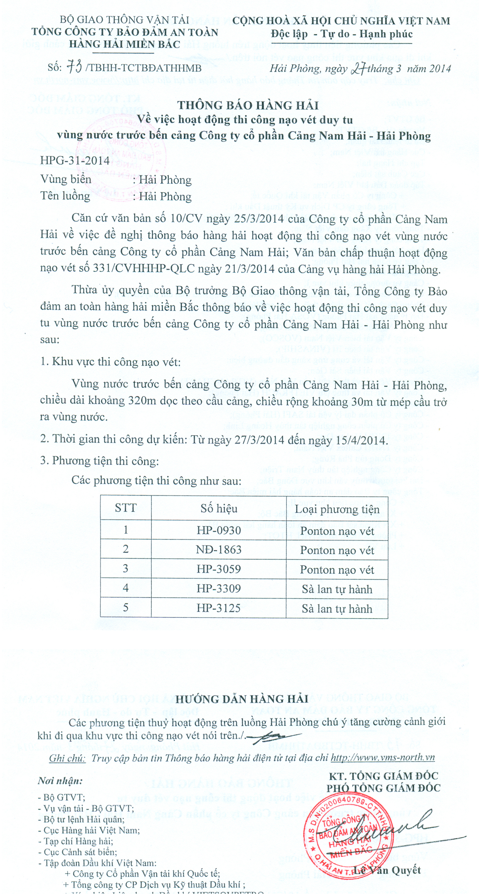 Căn cứ văn bản số 10/CV ngày 25/3/2014 của Công ty cổ phần Cảng Nam Hải về việc đề nghị thông báo hàng hải hoạt động thi công nạo vét vùng nước trước bến cảng Công ty cổ phần Cảng Nam Hải; Văn bản chấp thuận hoạt động nạo vét số 331/CVHHHP-QLC ngày 21/3/2014 của Cảng vụ hàng hải Hải Phòng.