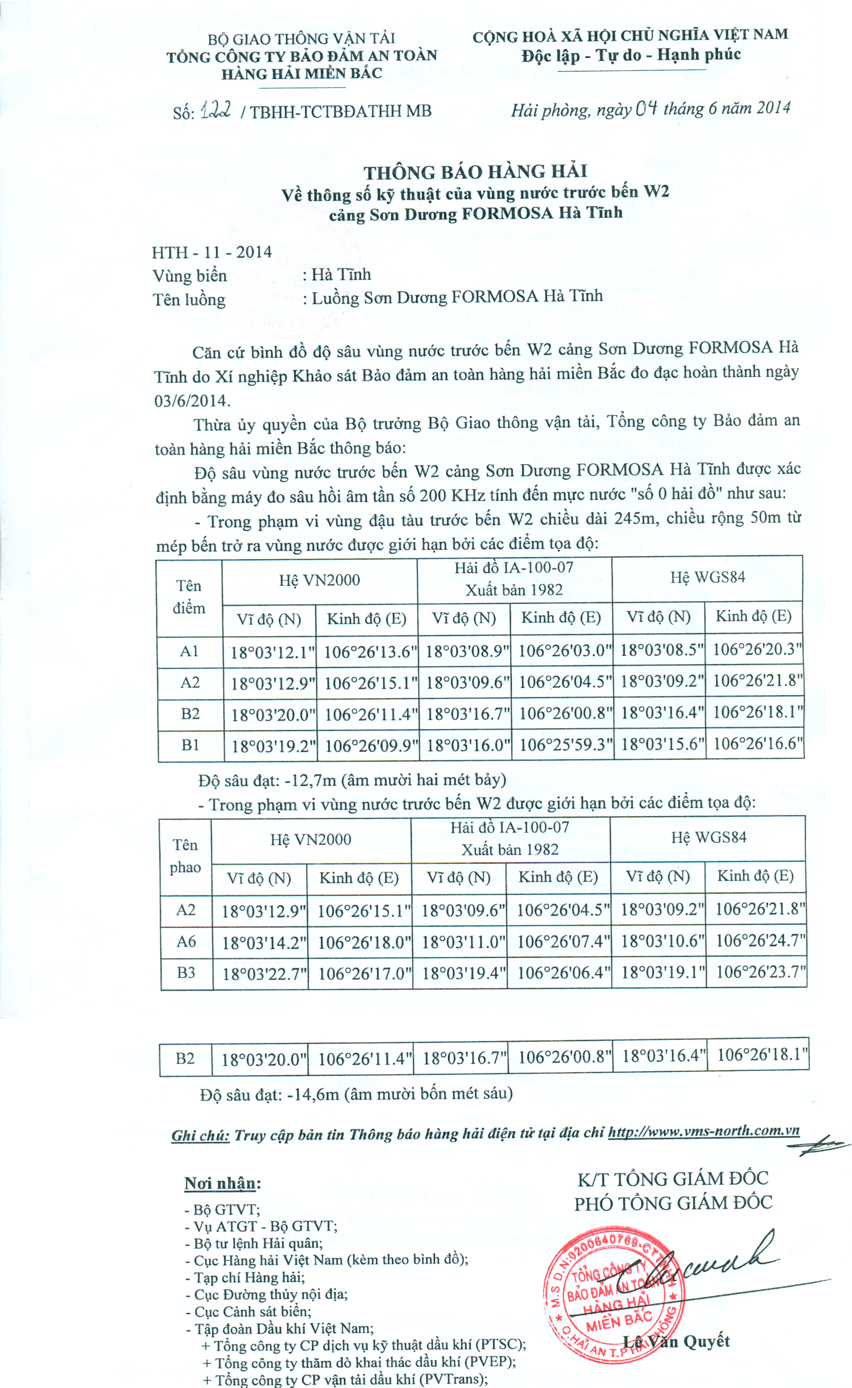 Thừa ủy quyền của Bộ trưởng Bộ Giao thông vận tải, Tổng Công ty Bảo đảm an toàn hàng hải miền Bắc thông báo hoạt động thi công nạo vét duy tu vùng nước trước cầu cảng Transvina như sau: