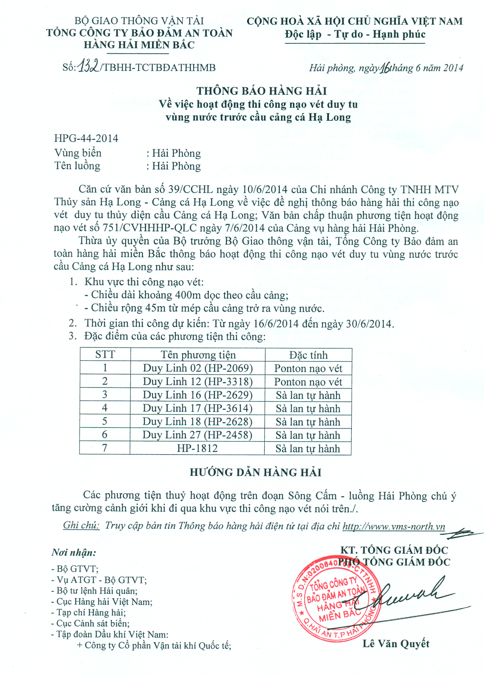 Căn cứ văn bản số 39/CCHL ngày 10/6/2014 của Chi nhánh Công ty TNHH MTV Thủy sản Hạ Long - Cảng cá Hạ Long về việc đề nghị thông báo hàng hải thi công nạo vét duy tu thủy diện cầu Cảng cá Hạ Long; Văn bản chấp thuận phương tiện hoạt động nạo vét số 751/CVHHHP-QLC ngày 7/6/2014 của Cảng vụ hàng hải Hải Phòng.