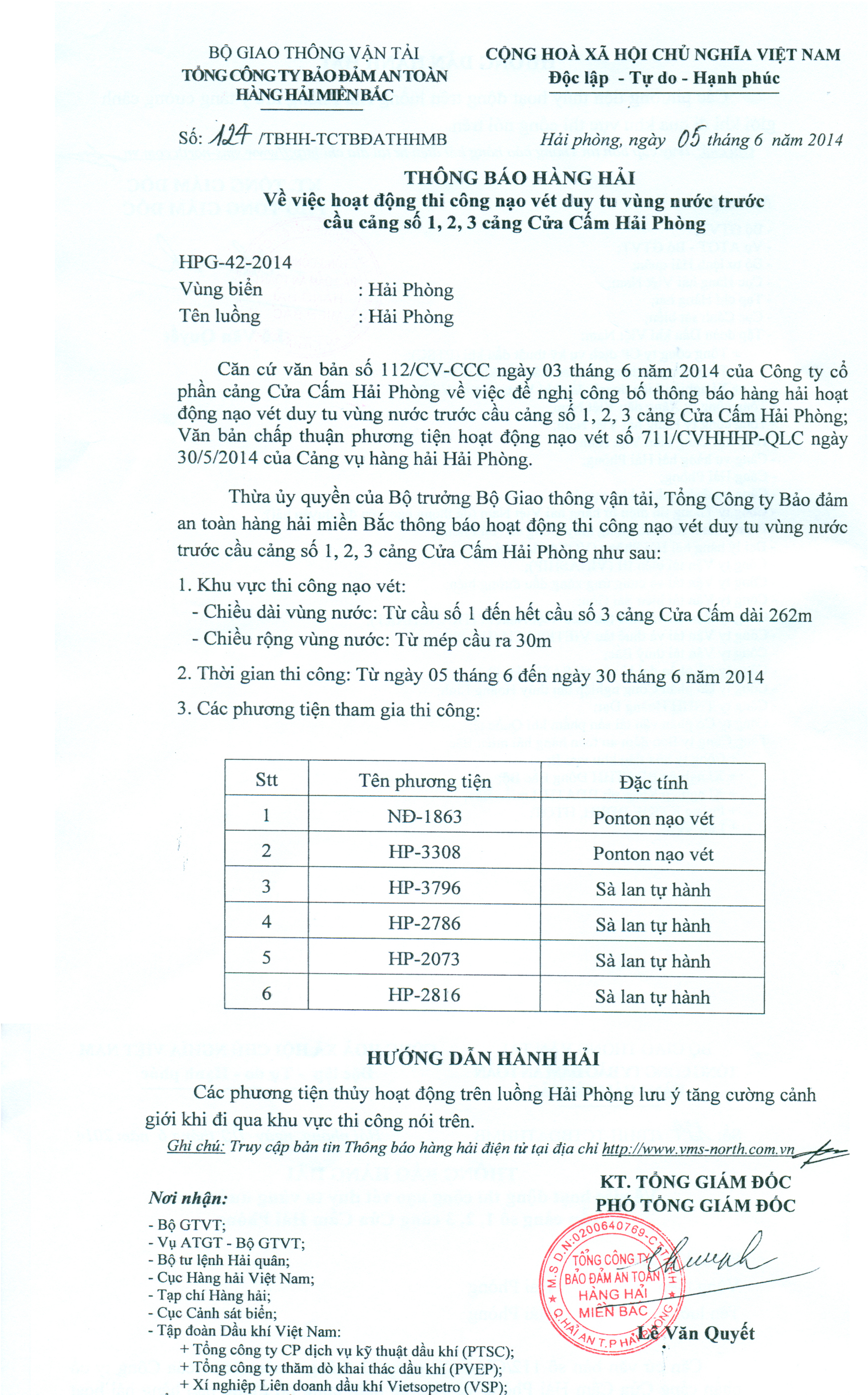 Căn cứ văn bản số 000464/XNHP ngày 04 tháng 6 năm 2014 của Xí nghiệp xăng dầu PETEC Hải Phòng về việc đề nghị công bố thông báo hàng hải hoạt động nạo vét duy tu vùng nước trước cầu cảng Xí nghiệp xăng dầu PETEC Hải Phòng; Văn bản chấp thuận phương tiện hoạt động nạo vét số 723/CVHHHP-QLC ngày 03/6/2014 của Cảng vụ hàng hải Hải Phòng.