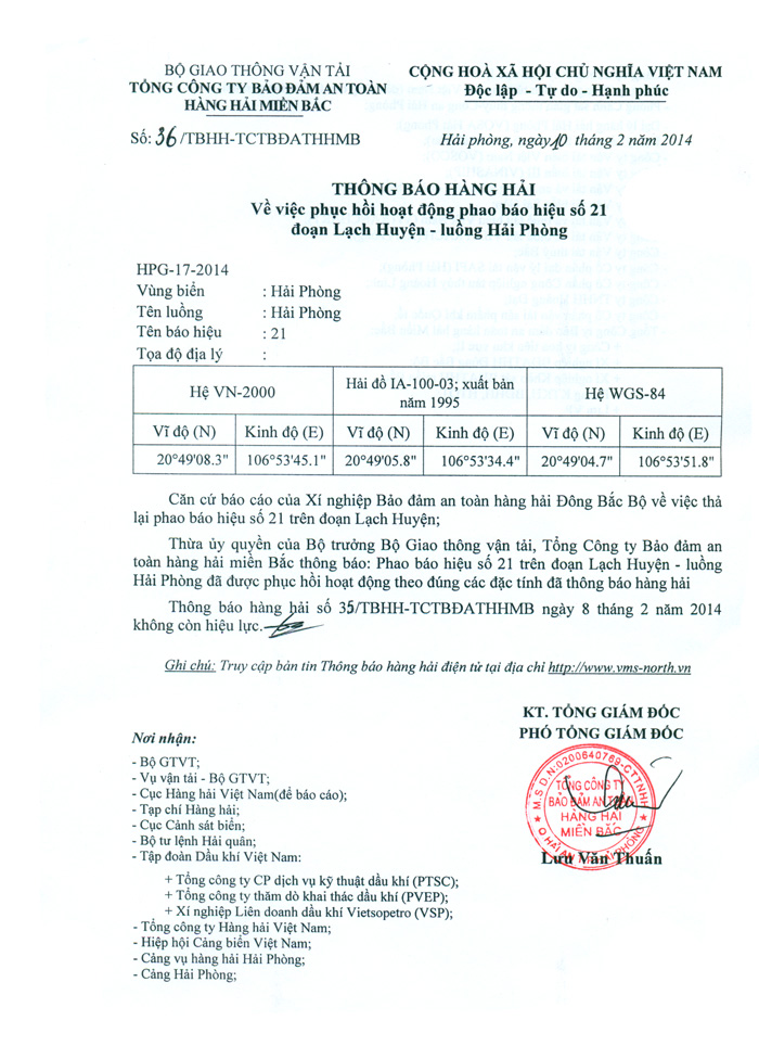 Thừa ủy quyền của Bộ trưởng Bộ Giao thông vận tải, Tổng Công ty Bảo đảm an toàn hàng hải miền Bắc thông báo: Phao báo hiệu số 21 trên đoạn Lạch Huyện - luồng Hải Phòng đã được phục hồi hoạt động theo đúng các đặc tính đã thông báo hàng hải