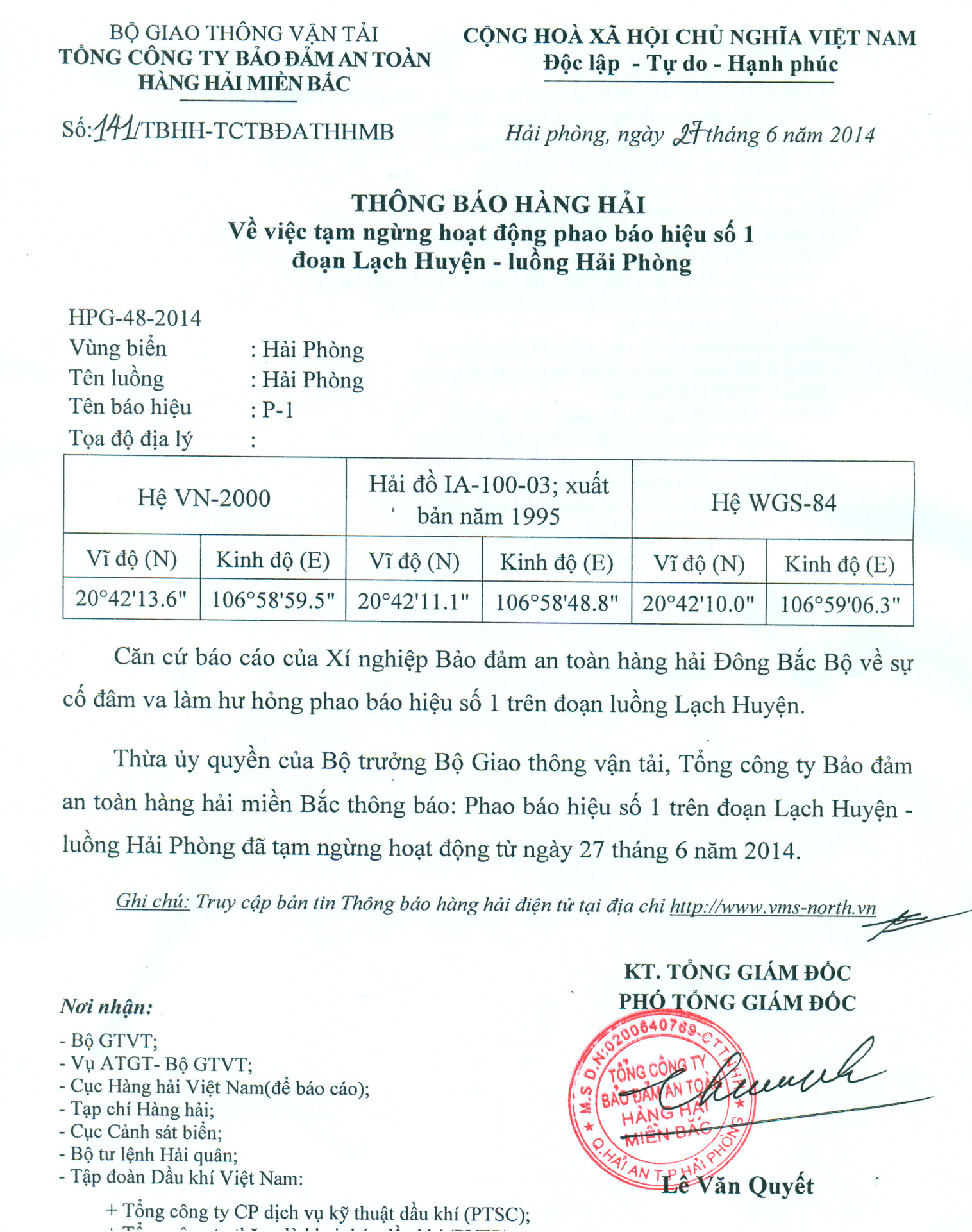 Thừa ủy quyền của Bộ trưởng Bộ Giao thông vận tải, Tổng công ty Bảo đảm an toàn hàng hải miền Bắc thông báo: Phao báo hiệu số 1 trên đoạn Lạch Huyện - luồng Hải Phòng đã tạm ngừng hoạt động từ ngày 27 tháng 6 năm 2014.