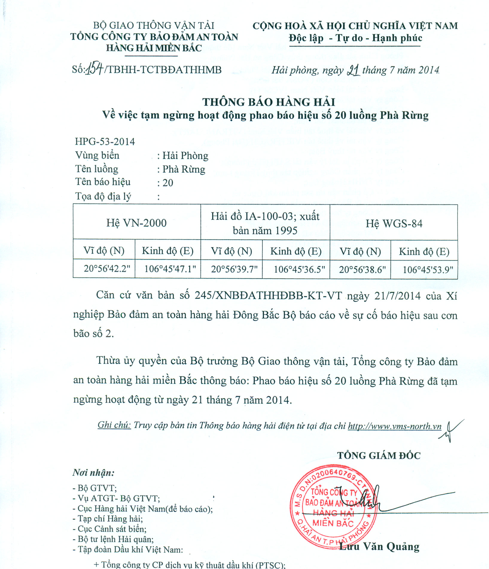Thừa ủy quyền của Bộ trưởng Bộ Giao thông vận tải, Tổng công ty Bảo đảm an toàn hàng hải miền Bắc thông báo: Phao báo hiệu số 20 luồng Phà Rừng đã tạm ngừng hoạt động từ ngày 21 tháng 7 năm 2014.