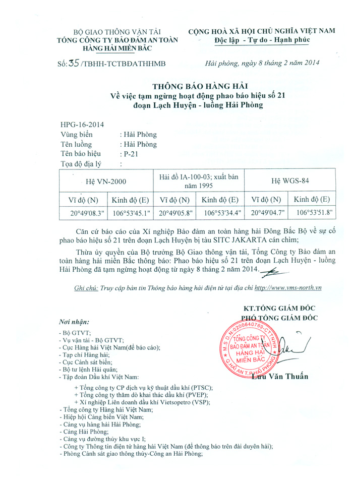 Căn cứ báo cáo của Xí nghiệp Bảo đảm an toàn hàng hải Đông Bắc Bộ về sự cố phao báo hiệu số 21 trên đoạn Lạch Huyện bị tàu SITC JAKARTA cán chìm;