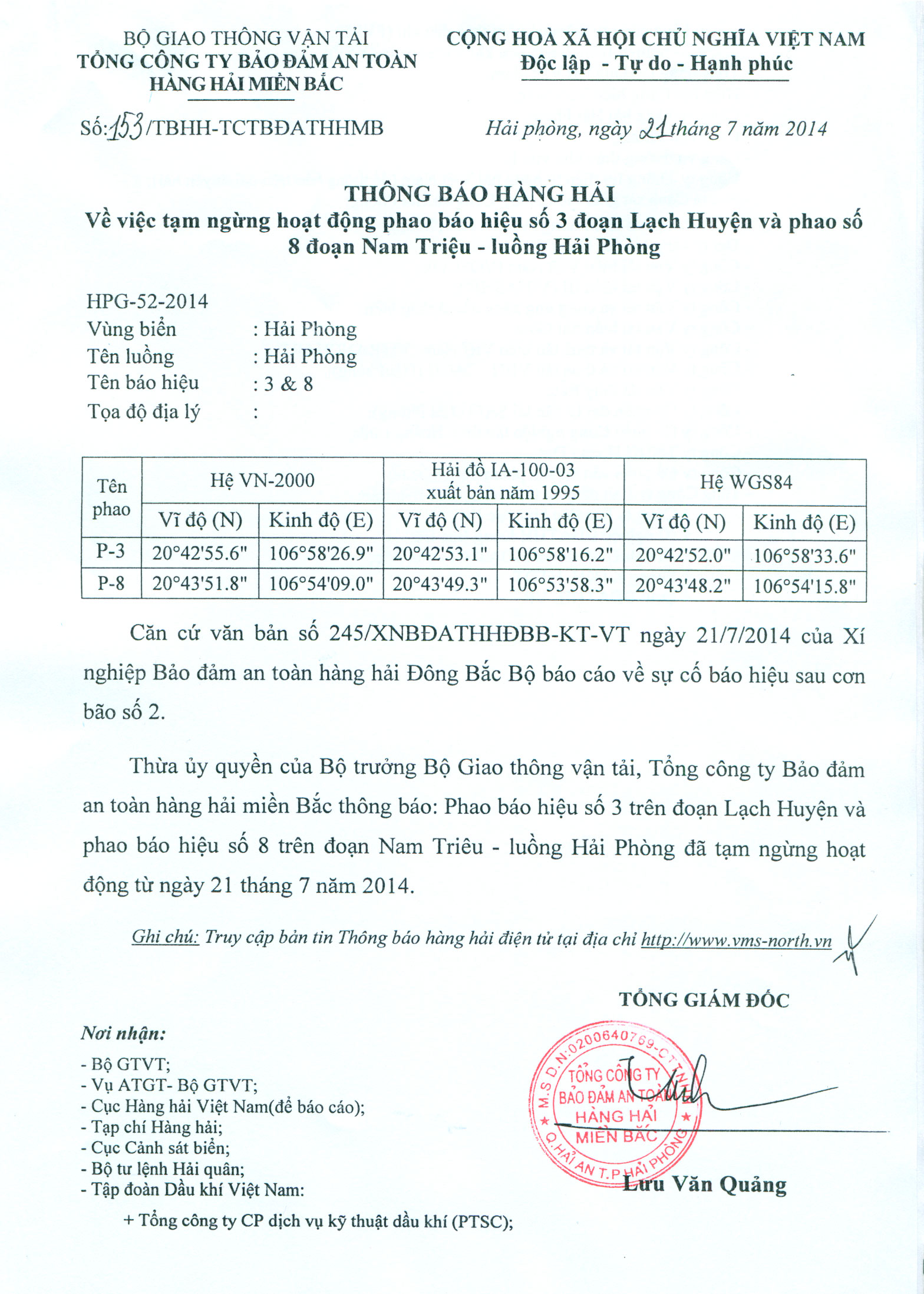 Thừa ủy quyền của Bộ trưởng Bộ Giao thông vận tải, Tổng công ty Bảo đảm an toàn hàng hải miền Bắc thông báo: Phao báo hiệu số 3 trên đoạn Lạch Huyện và phao báo hiệu số 8 trên đoạn Nam Triêu - luồng Hải Phòng đã tạm ngừng hoạt động từ ngày 21 tháng 7 năm 2014.