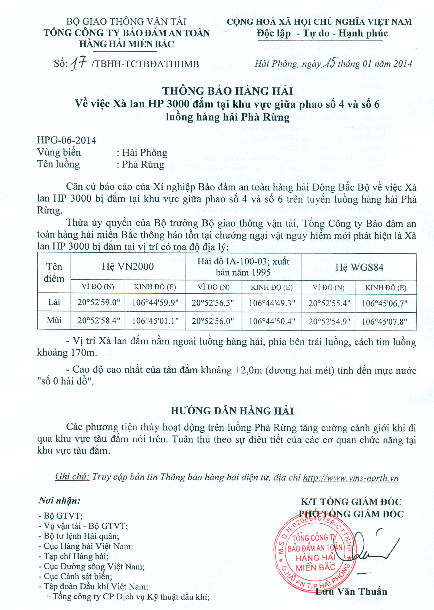 Thừa ủy quyền của Bộ trưởng Bộ giao thông vận tải, Tổng Công ty Bảo đảm an toàn hàng hải miền Bắc thông báo tồn tại chướng ngại vật nguy hiểm mới phát hiện là Xà lan HP 3000 bị đắm tại vị trí có tọa độ địa lý: