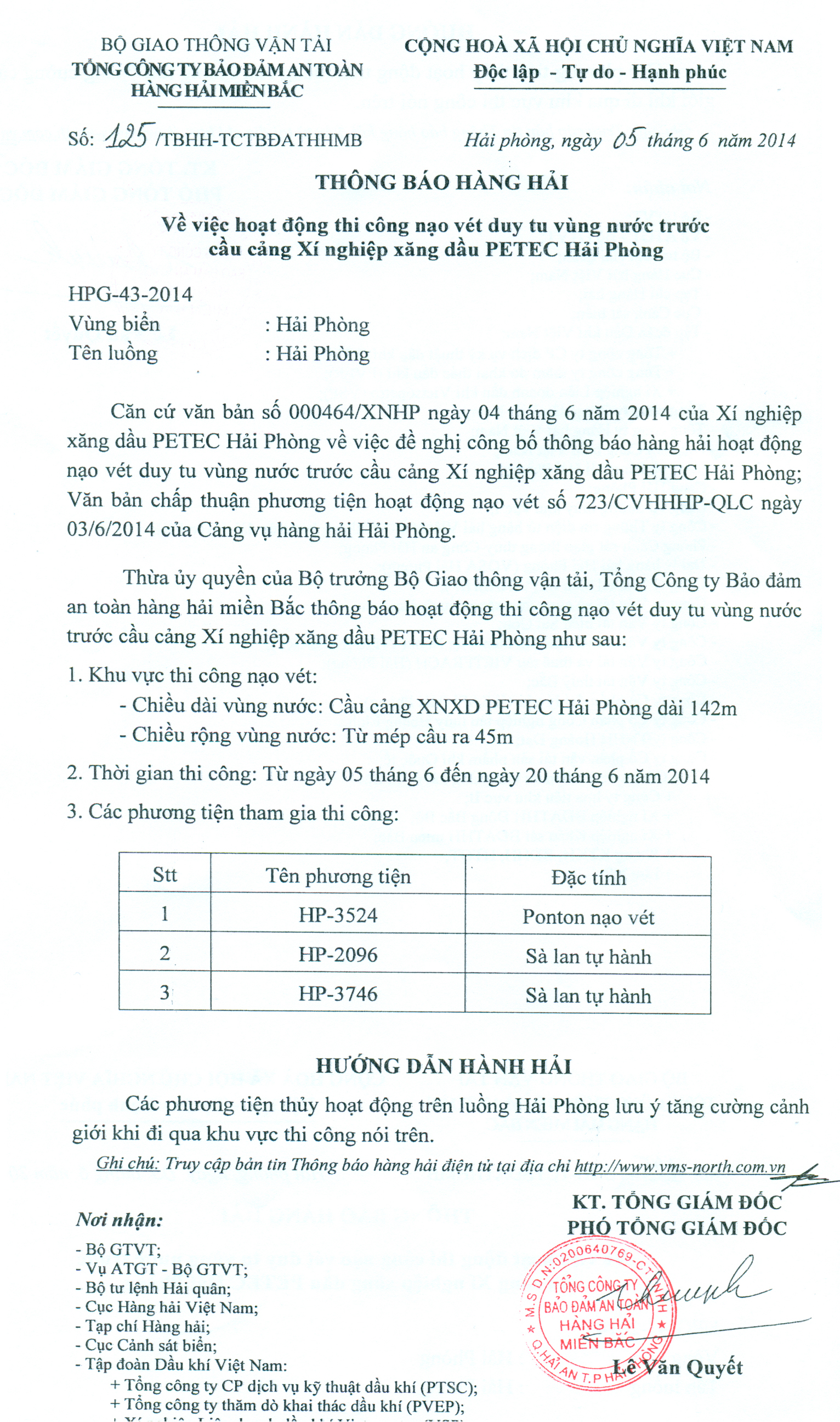 Thừa ủy quyền của Bộ trưởng Bộ Giao thông vận tải, Tổng công ty Bảo đảm an toàn hàng hải miền Bắc thông báo: Độ sâu luồng hàng hải Hải Thịnh - Nam Định được xác định bằng máy hồi âm tần số 200 kHz tính đến mực nước "số 0 hải đồ" như sau: