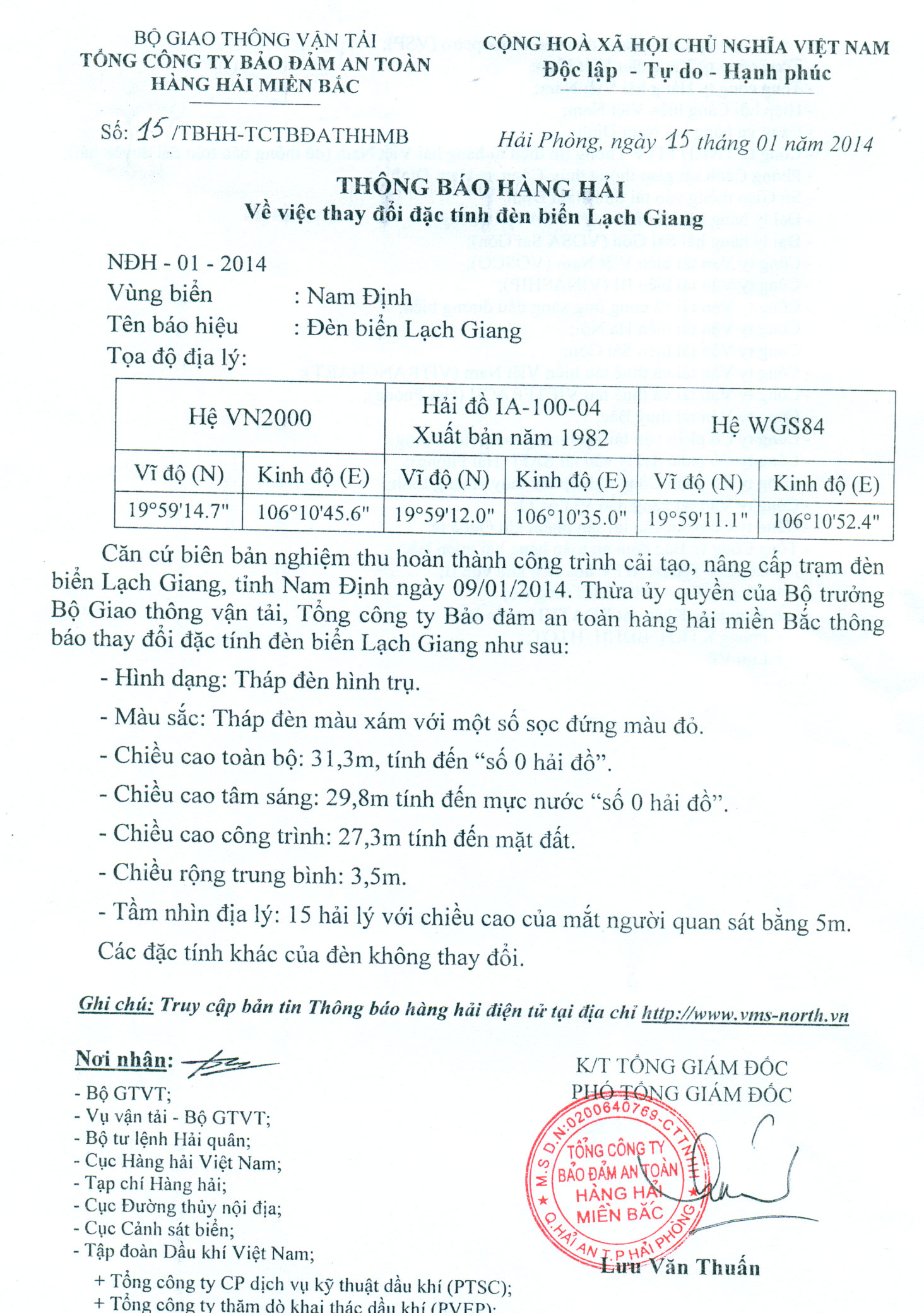 Căn cứ biên bản nghiệm thu hoàn thành công trình cải tạo, nâng cấp trạm đèn biển Lạch Giang, tỉnh Nam Định ngày 09/01/2014. Thừa ủy quyền của Bộ trưởng Bộ Giao thông vận tải, Tổng công ty Bảo đảm an toàn hàng hải miền Bắc thông báo thay đổi đặc tính đèn biển Lạch Giang như sau: