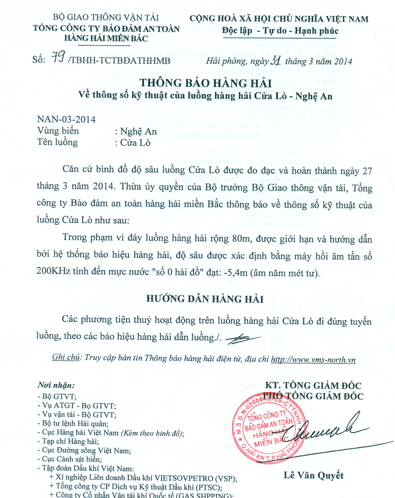 Căn cứ bình đồ độ sâu luồng Cửa Lò được đo đạc và hoàn thành ngày 27 tháng 3 năm 2014. Thừa ủy quyền của Bộ trưởng Bộ Giao thông vận tải, Tổng công ty Bảo đảm an toàn hàng hải miền Bắc thông báo về thông số kỹ thuật của luồng Cửa Lò như sau: