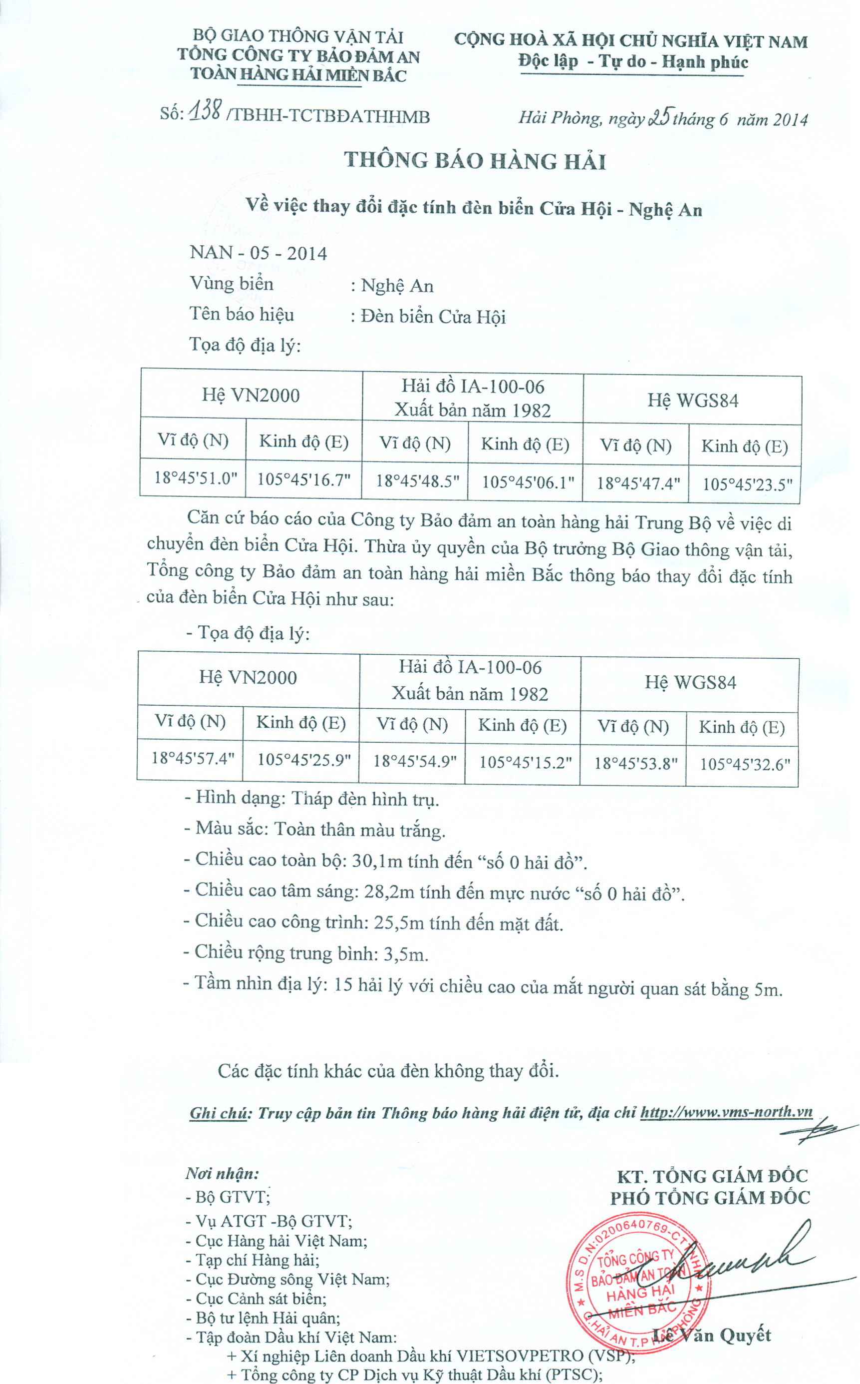 Căn cứ báo cáo của Công ty Bảo đảm an toàn hàng hải Trung Bộ về việc di chuyển đèn biển Cửa Hội. Thừa ủy quyền của Bộ trưởng Bộ Giao thông vận tải, Tổng công ty Bảo đảm an toàn hàng hải miền Bắc thông báo thay đổi đặc tính của đèn biển Cửa Hội như sau: