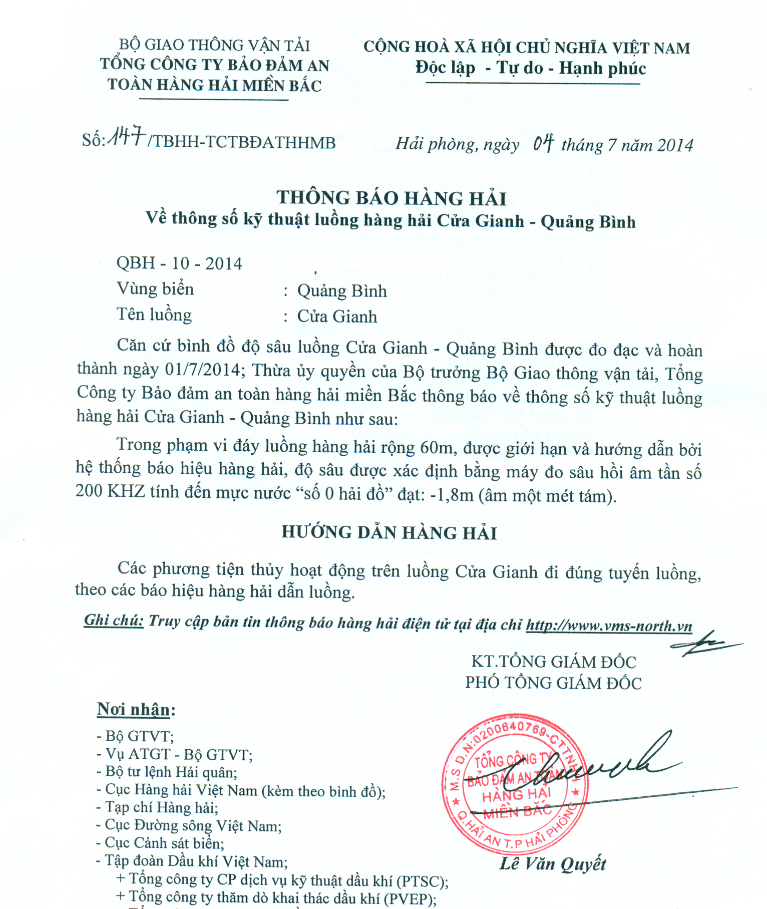 Căn cứ bình đồ độ sâu luồng Cửa Gianh - Quảng Bình được đo đạc và hoàn thành ngày 01/7/2014; Thừa ủy quyền của Bộ trưởng Bộ Giao thông vận tải, Tổng Công ty Bảo đảm an toàn hàng hải miền Bắc thông báo về thông số kỹ thuật luồng hàng hải Cửa Gianh - Quảng Bình như sau: