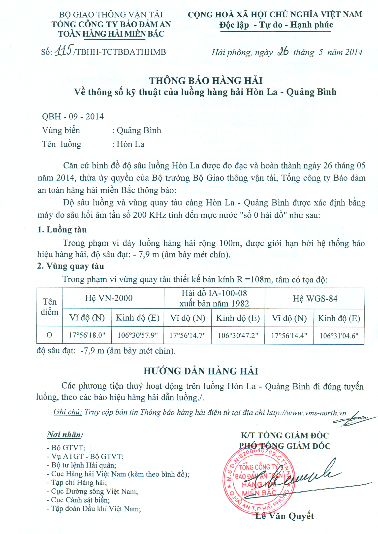 Căn cứ bình đồ độ sâu luồng Hòn La được đo đạc và hoàn thành ngày 26 tháng 05 năm 2014, thừa ủy quyền của Bộ trưởng Bộ Giao thông vận tải, Tổng công ty Bảo đảm an toàn hàng hải miền Bắc thông báo: