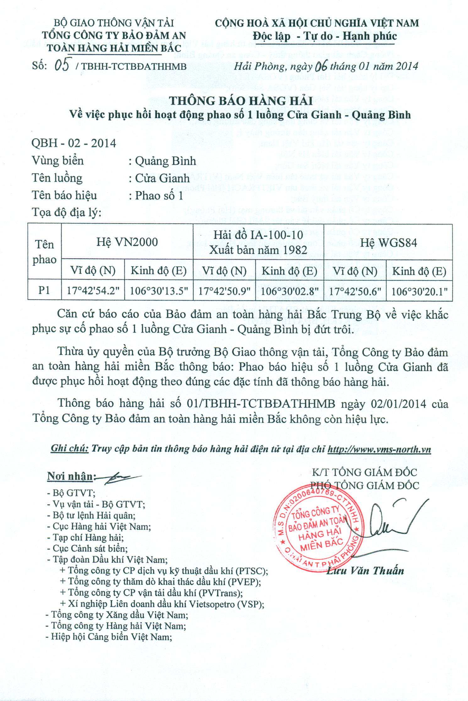 Thừa ủy quyền của Bộ trưởng Bộ Giao thông vận tải, Tổng Công ty Bảo đảm an toàn hàng hải miền Bắc thông báo: Phao báo hiệu số 1 luồng Cửa Gianh đã được phục hồi hoạt động theo đúng các đặc tính đã thông báo hàng hải.