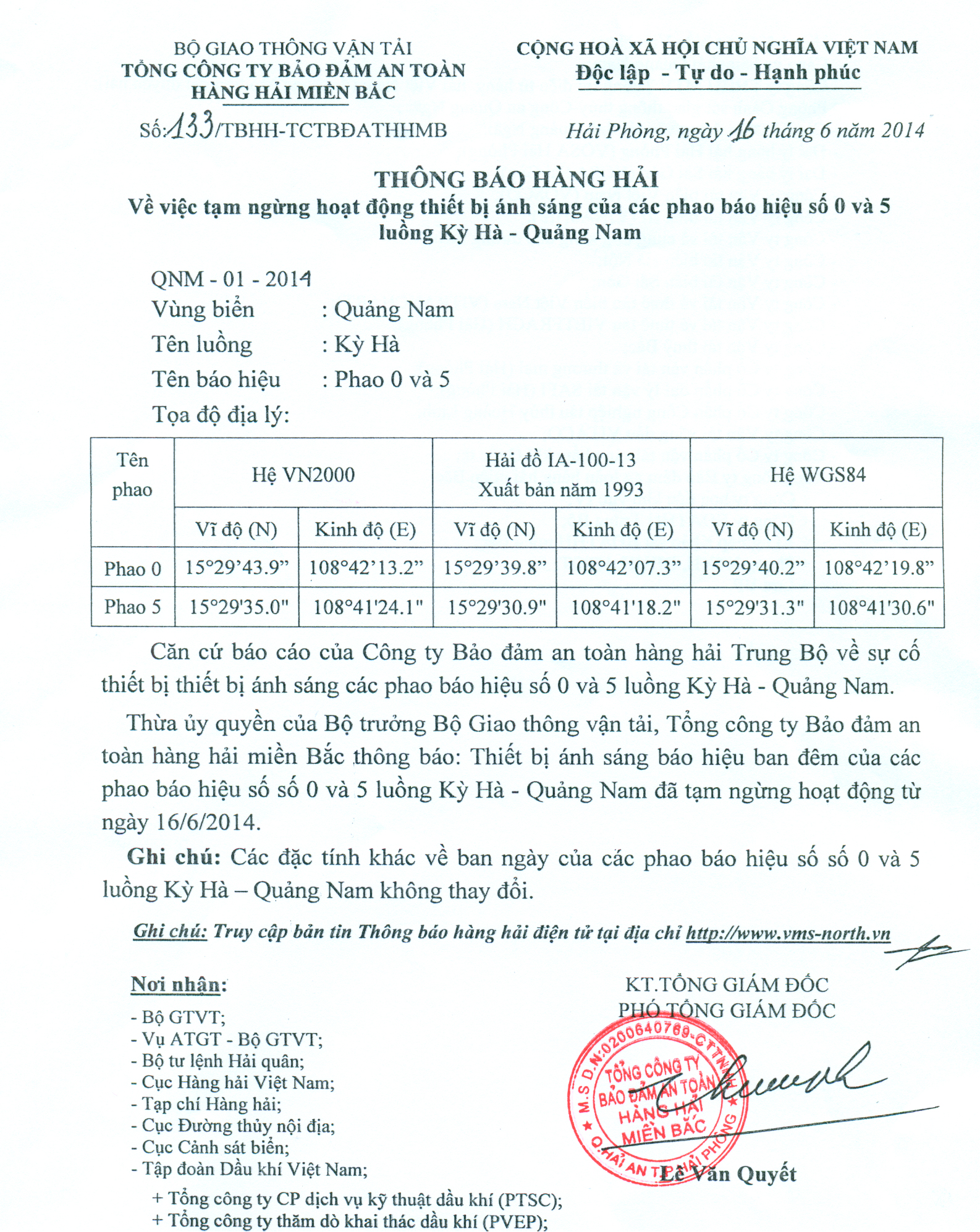 Thừa ủy quyền của Bộ trưởng Bộ Giao thông vận tải, Tổng công ty Bảo đảm an toàn hàng hải miền Bắc thông báo: Thiết bị ánh sáng báo hiệu ban đêm của các phao báo hiệu số số 0 và 5 luồng Kỳ Hà - Quảng Nam đã tạm ngừng hoạt động từ ngày 16/6/2014.