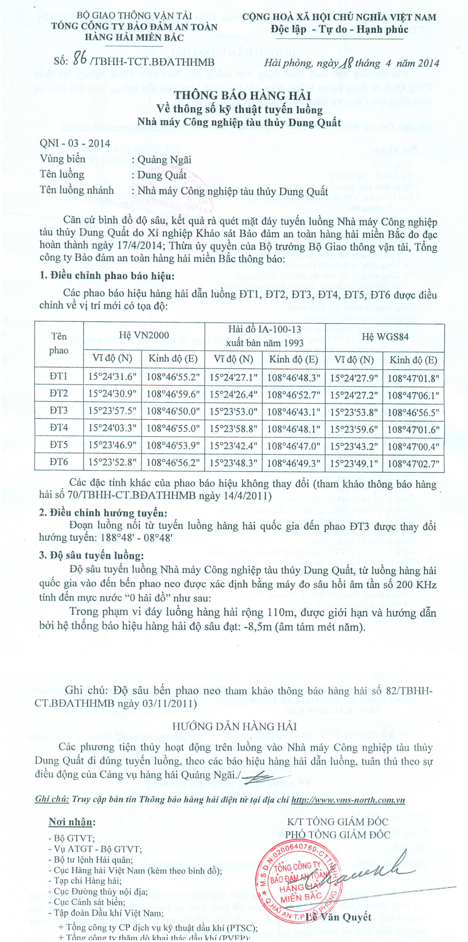 Căn cứ bình đồ độ sâu, kết quả rà quét mặt đáy tuyến luồng Nhà máy Công nghiệp tàu thủy Dung Quất do Xí nghiệp Khảo sát Bảo đảm an toàn hàng hải miền Bắc đo đạc hoàn thành ngày 17/4/2014; Thừa ủy quyền của Bộ trưởng Bộ Giao thông vận tải, Tổng công ty Bảo đảm an toàn hàng hải miền Bắc thông báo: