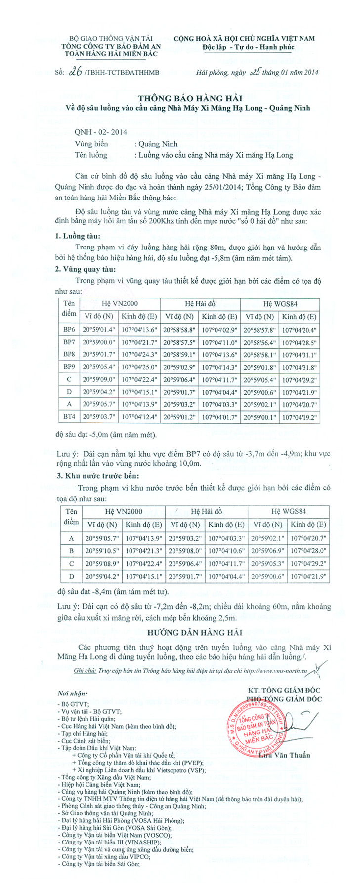Căn cứ bình đồ độ sâu luồng vào cầu cảng Nhà máy Xi măng Hạ Long - Quảng Ninh được đo đạc và hoàn thành ngày 25/01/2014; Tổng Công ty Bảo đảm an toàn hàng hải Miền Bắc thông báo: