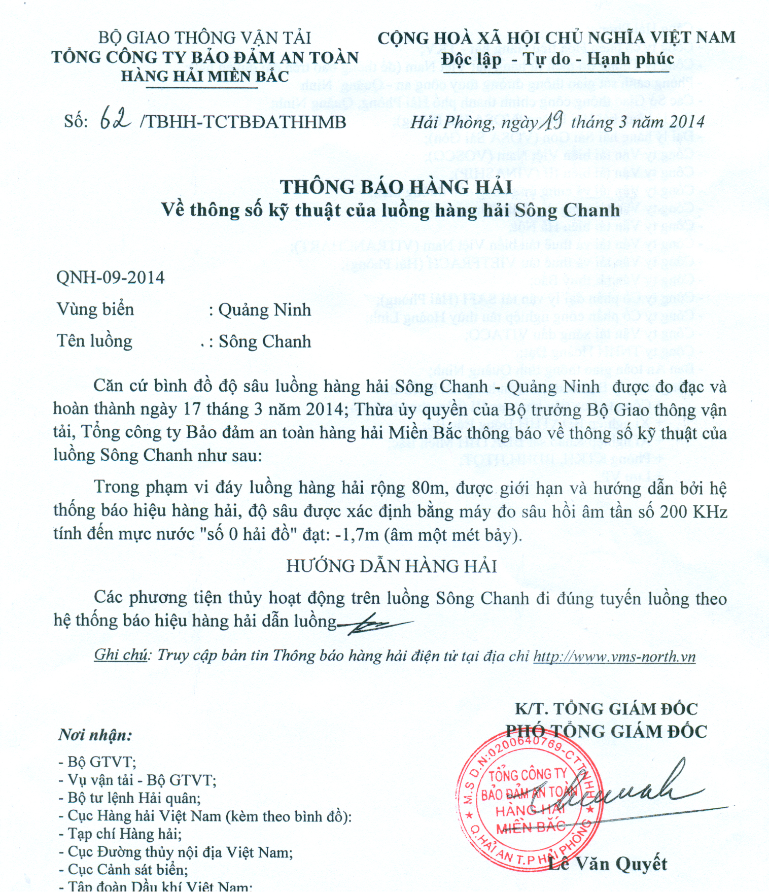Căn cứ bình đồ độ sâu luồng hàng hải Sông Chanh - Quảng Ninh được đo đạc và hoàn thành ngày 17 tháng 3 năm 2014; Thừa ủy quyền của Bộ trưởng Bộ Giao thông vận tải, Tổng công ty Bảo đảm an toàn hàng hải Miền Bắc thông báo về thông số kỹ thuật của luồng Sông Chanh như sau: