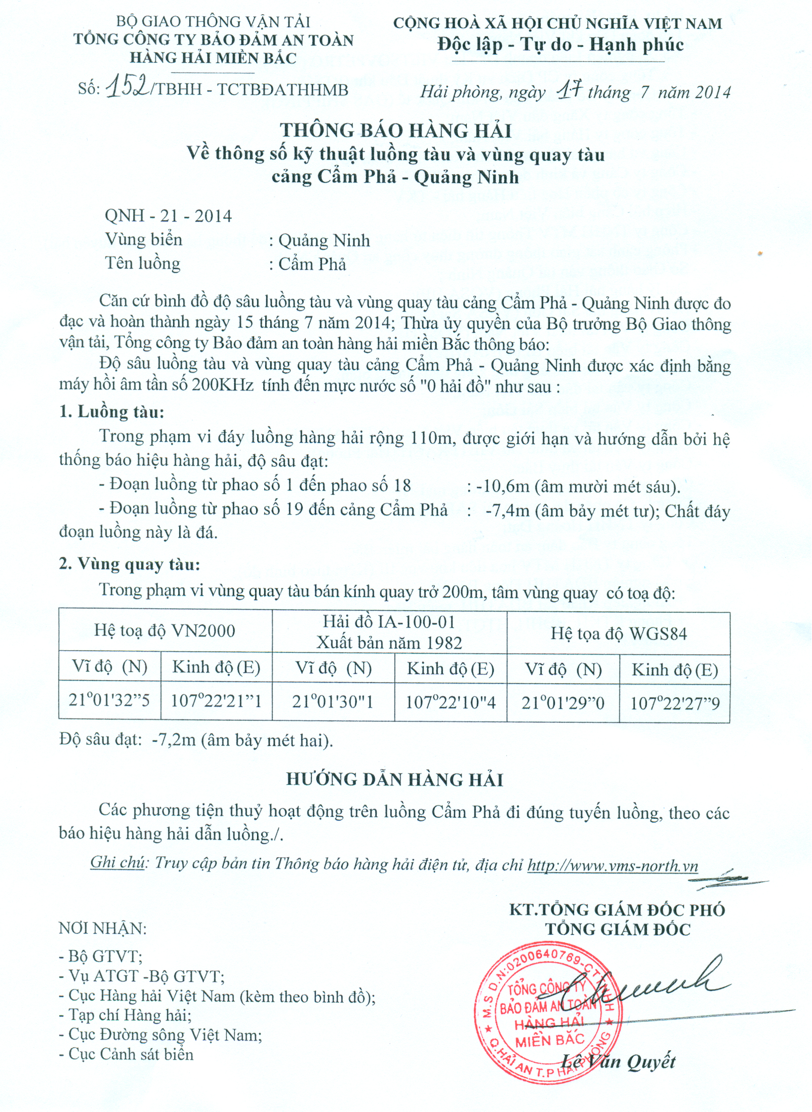 Căn cứ bình đồ độ sâu luồng tàu và vùng quay tàu cảng Cẩm Phả - Quảng Ninh được đo đạc và hoàn thành ngày 15 tháng 7 năm 2014; Thừa ủy quyền của Bộ trưởng Bộ Giao thông vận tải, Tổng công ty Bảo đảm an toàn hàng hải miền Bắc thông báo: