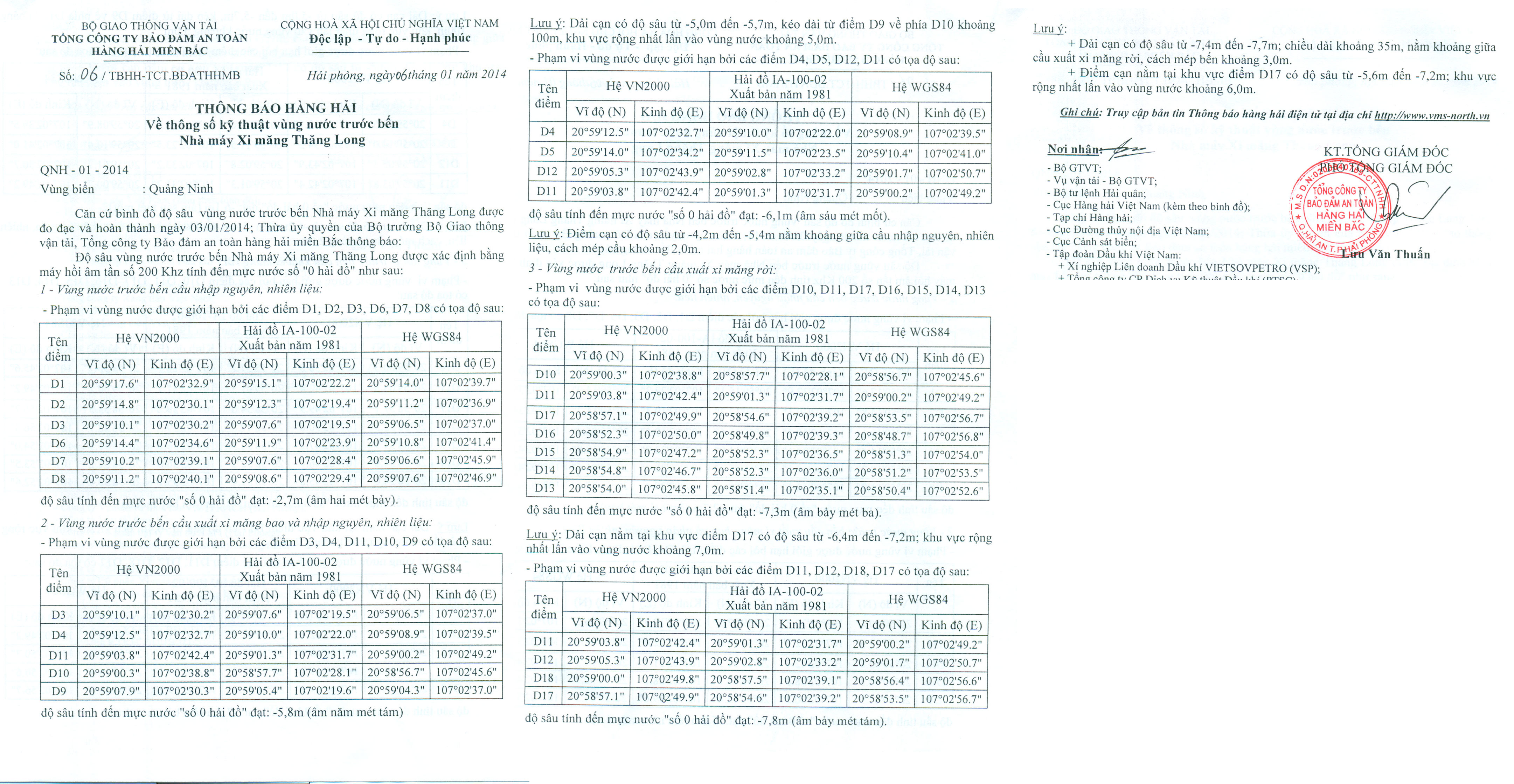 Căn cứ bình đồ độ sâu vùng nước trước bến Nhà máy Xi măng Thăng Long được đo đạc và hoàn thành ngày 03/01/2014; Thừa ủy quyền của Bộ trưởng Bộ Giao thông vận tải, Tổng công ty Bảo đảm an toàn hàng hải miền Bắc thông báo: