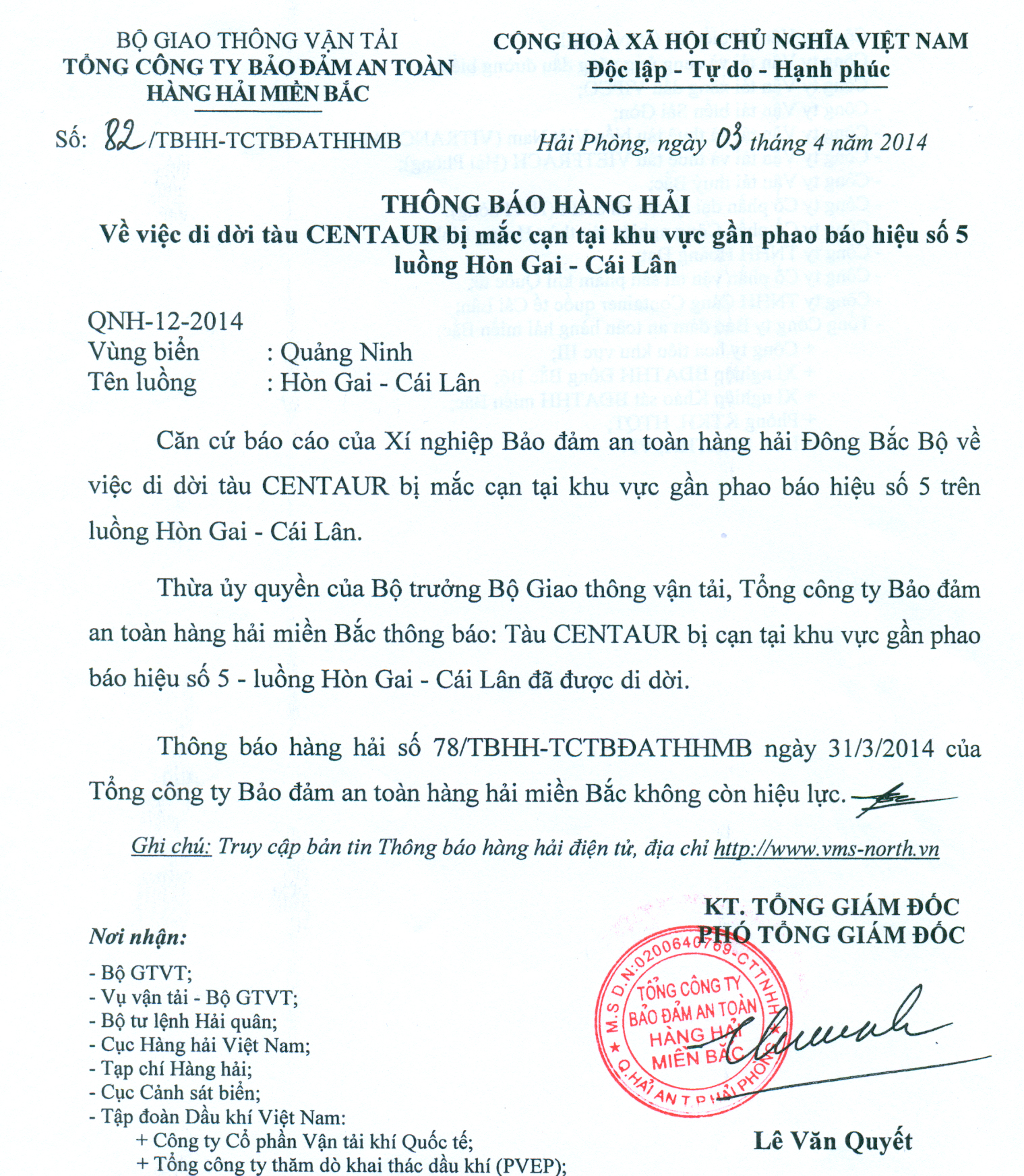 Thừa ủy quyền của Bộ trưởng Bộ Giao thông vận tải, Tổng công ty Bảo đảm an toàn hàng hải miền Bắc thông báo: Tàu CENTAUR bị cạn tại khu vực gần phao báo hiệu số 5 - luồng Hòn Gai - Cái Lân đã được di dời.