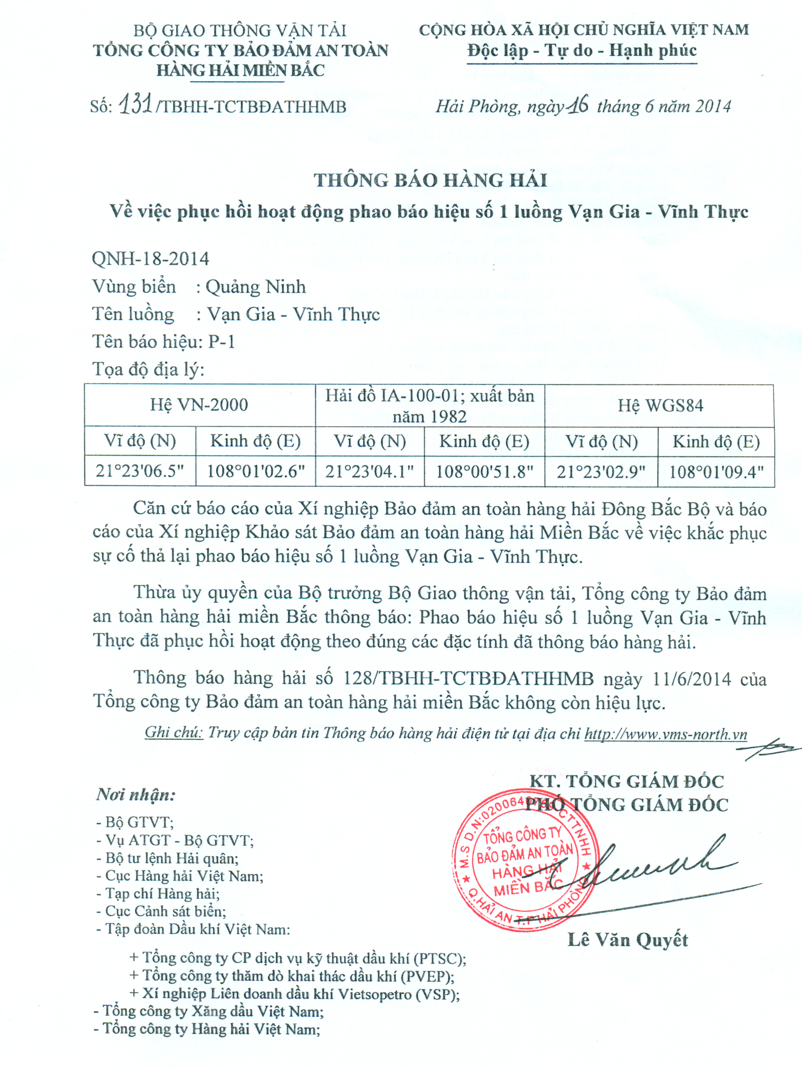 Thừa ủy quyền của Bộ trưởng Bộ Giao thông vận tải, Tổng công ty Bảo đảm an toàn hàng hải miền Bắc thông báo: Phao báo hiệu số 1 luồng Vạn Gia - Vĩnh Thực đã phục hồi hoạt động theo đúng các đặc tính đã thông báo hàng hải.
