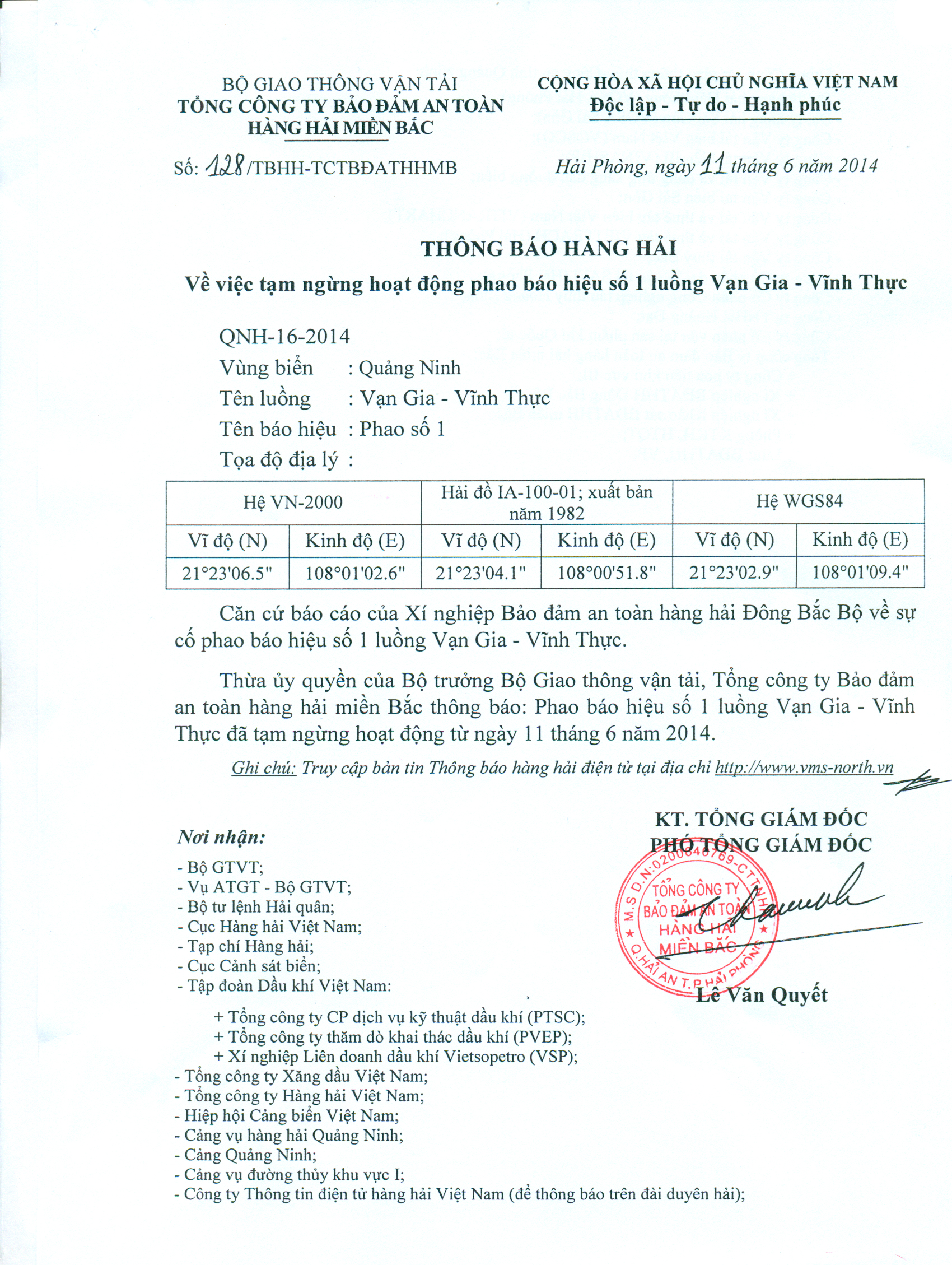 Thừa ủy quyền của Bộ trưởng Bộ Giao thông vận tải, Tổng công ty Bảo đảm an toàn hàng hải miền Bắc thông báo: Phao báo hiệu số 1 luồng Vạn Gia - Vĩnh Thực đã tạm ngừng hoạt động từ ngày 11 tháng 6 năm 2014.