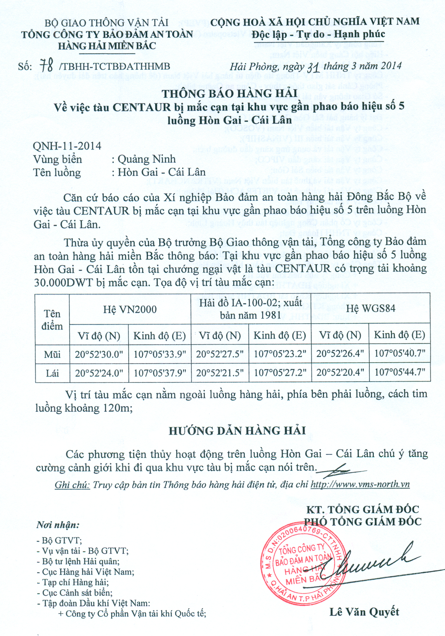 Thừa ủy quyền của Bộ trưởng Bộ Giao thông vận tải, Tổng công ty Bảo đảm an toàn hàng hải miền Bắc thông báo: Tại khu vực gần phao báo hiệu số 5 luồng Hòn Gai - Cái Lân tồn tại chướng ngại vật là tàu CENTAUR có trọng tải khoảng 30.000DWT bị mắc cạn. Tọa độ vị trí tàu mắc cạn:
