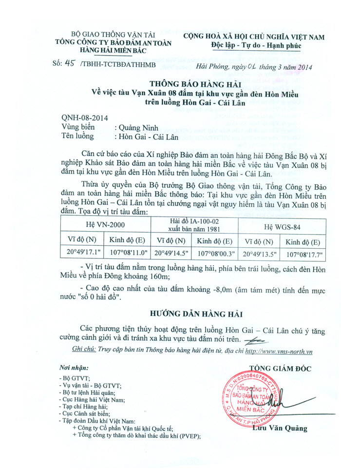 Thừa ủy quyền của Bộ trưởng Bộ Giao thông vận tải, Tổng Công ty Bảo đảm an toàn hàng hải miền Bắc thông báo: Tại khu vực gần đèn Hòn Miều trên luồng Hòn Gai – Cái Lân tồn tại chướng ngại vật nguy hiểm là tàu Vạn Xuân 08 bị đắm. Tọa độ vị trí tàu đắm: