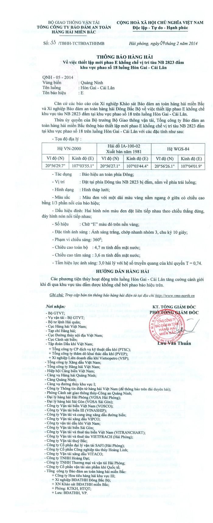 Thừa ủy quyền của Bộ trưởng Bộ Giao thông vận tải, Tổng công ty Bảo đảm an toàn hàng hải miền Bắc thông báo thiết lập mới phao E khống chế vị trí tàu NB 2823 đắm tại khu vực phao số 18 trên luồng Hòn Gai - Cái Lân với các đặc tính như sau: