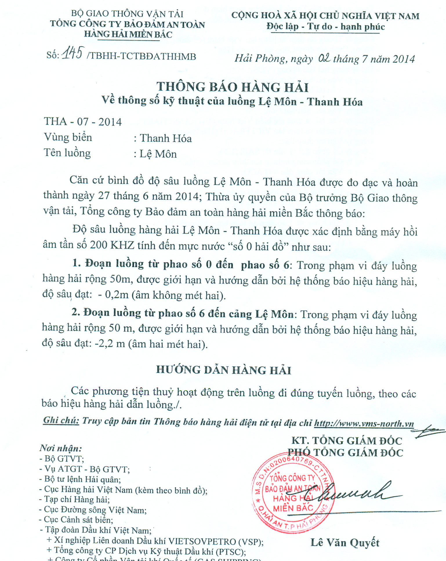 Căn cứ bình đồ độ sâu luồng Lệ Môn - Thanh Hóa được đo đạc và hoàn thành ngày 27 tháng 6 năm 2014; Thừa ủy quyền của Bộ trưởng Bộ Giao thông vận tải, Tổng công ty Bảo đảm an toàn hàng hải miền Bắc thông báo: