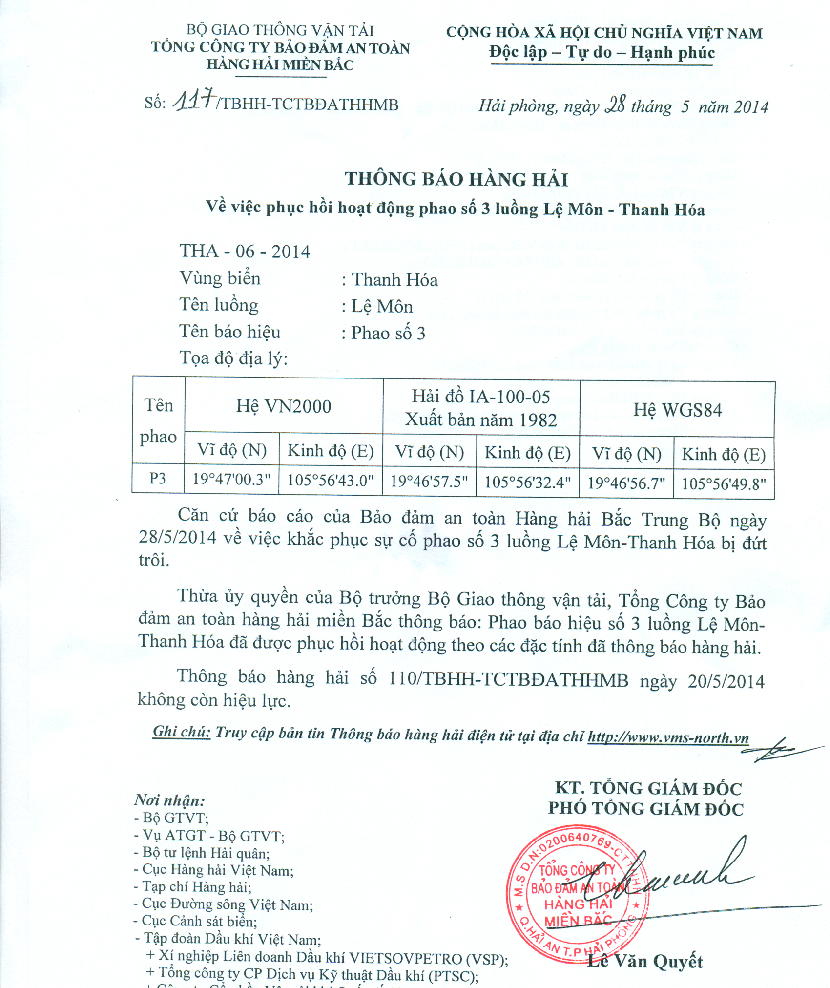 Thừa ủy quyền của Bộ trưởng Bộ Giao thông vận tải, Tổng Công ty Bảo đảm an toàn hàng hải miền Bắc thông báo: Phao báo hiệu số 3 luồng Lệ Môn-Thanh Hóa đã được phục hồi hoạt động theo các đặc tính đã thông báo hàng hải.